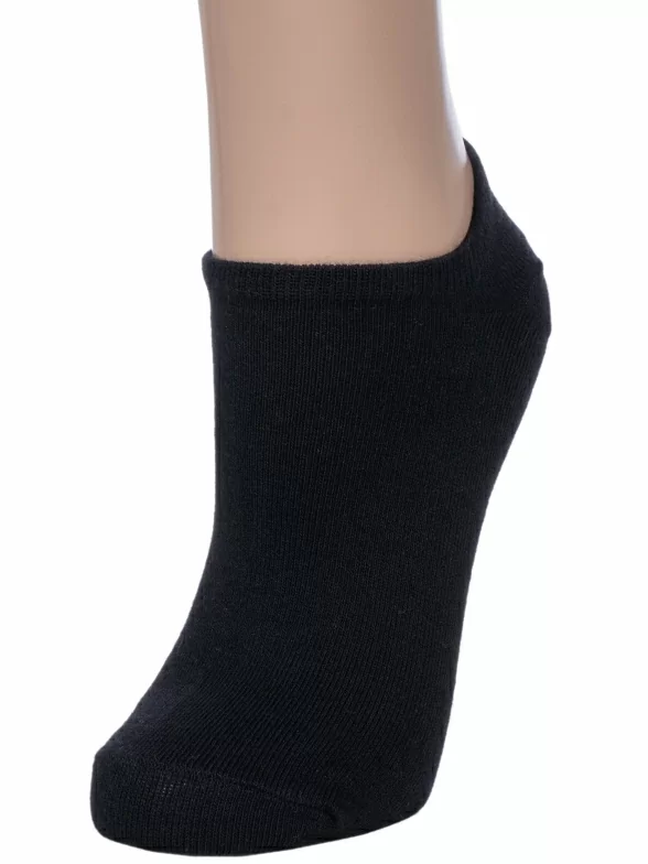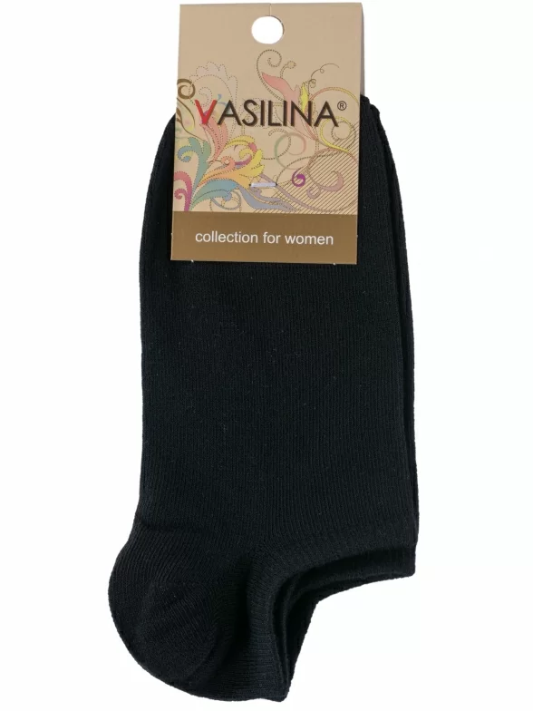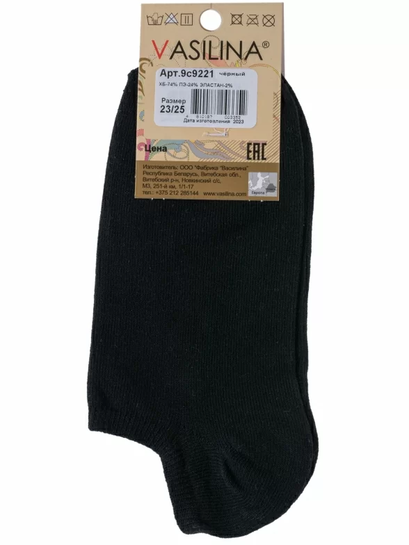 Круглогодичные или летние ультракороткие женские носки, цвет черный, классические, шов обычный (не бесшовные), принт (рисунок): однотонный, без рисунков/узоров, состав: 74% хлопок, 24% полиэстер, 2% эластан, арт. 9С9221. Производитель «ООО Фабрика Василина, Беларусь» под брендом «Vasilina».