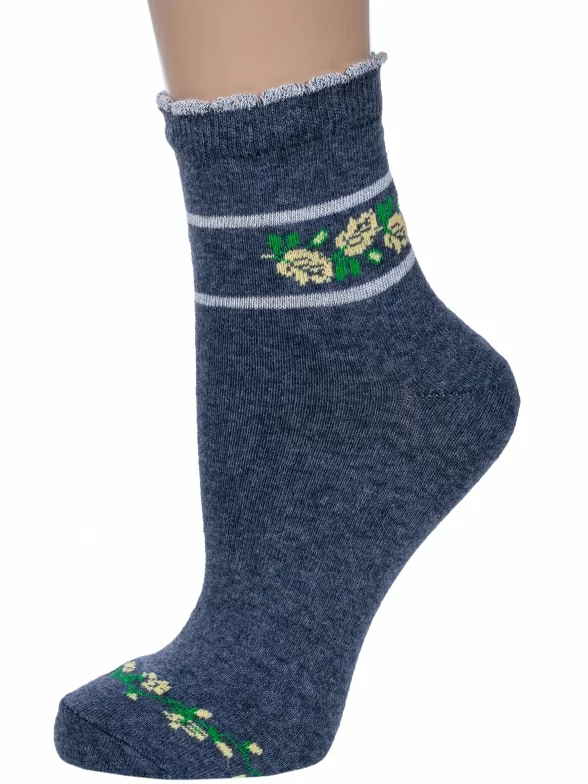 Круглогодичные укороченные женские носки, цвет темно-синий, повседневные, шов обычный (не бесшовные), принт (рисунок): с узором, цветы / растения, состав: 60% хлопок, 38% полиэстер, 2% эластан, арт. 0С9252. Производитель «ООО Фабрика Василина, Беларусь» под брендом «Vasilina».