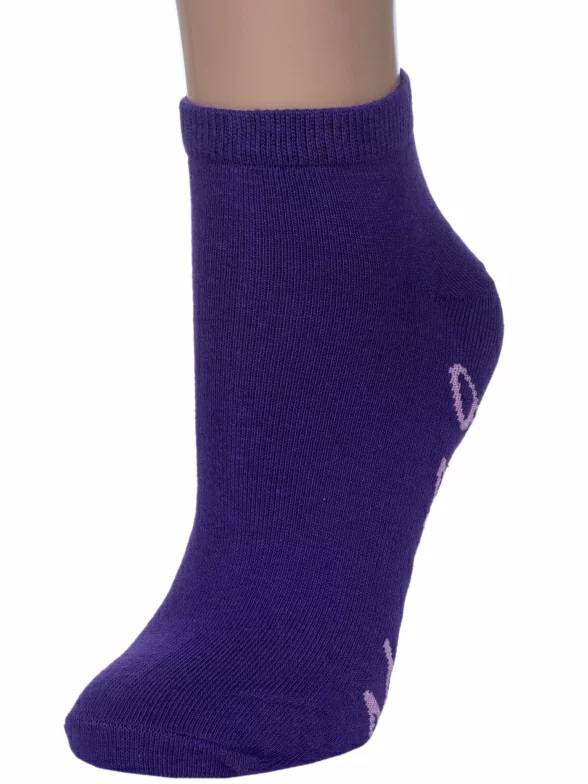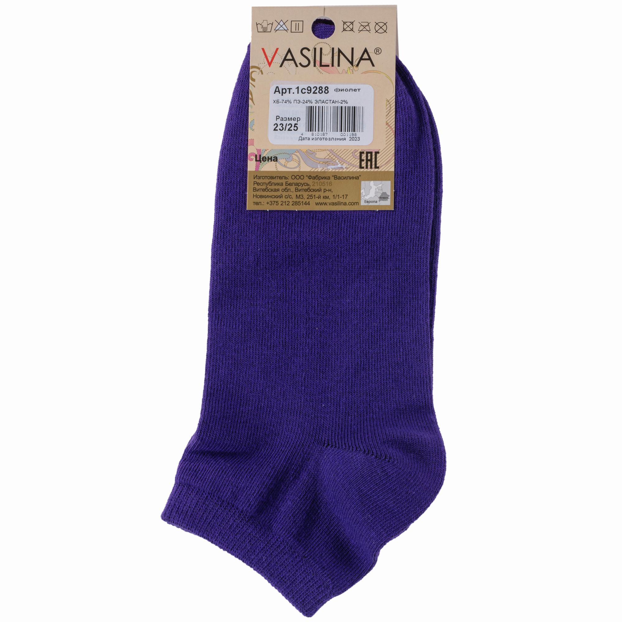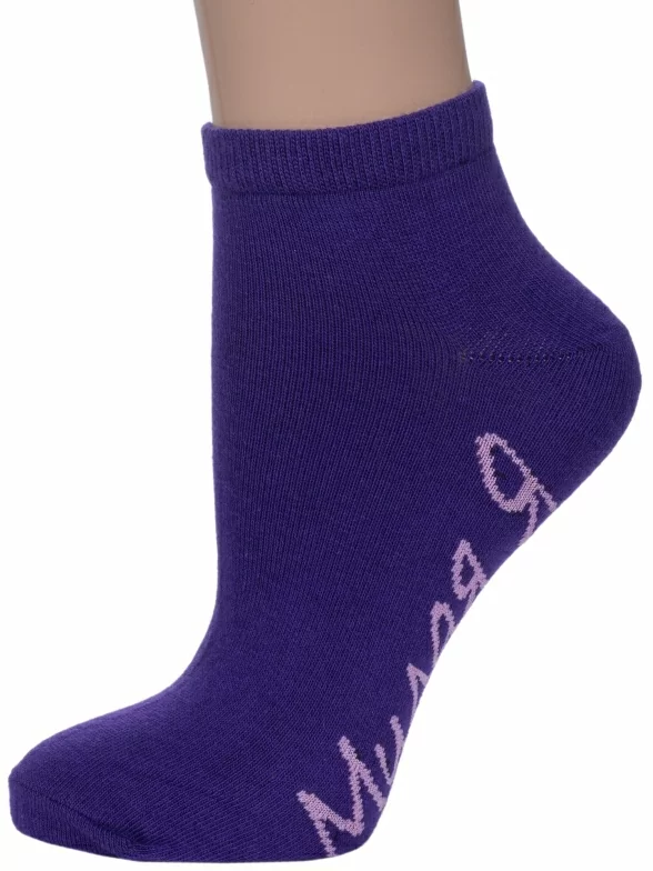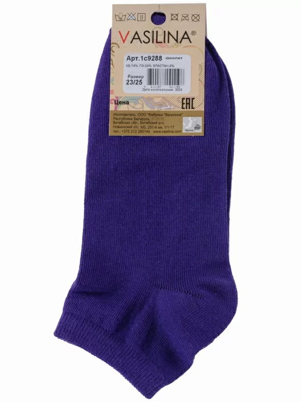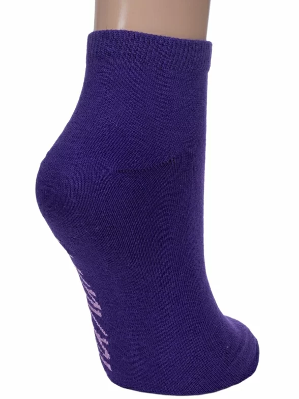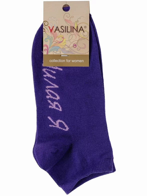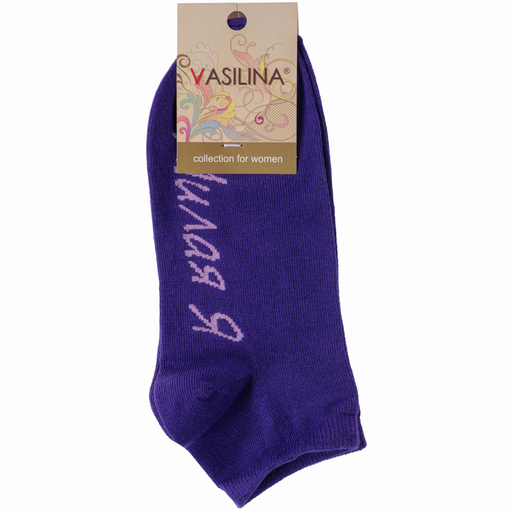 Круглогодичные короткие женские носки, цвет фиолетовый, повседневные, шов обычный (не бесшовные), принт (рисунок): надписи, с узором, состав: 74% хлопок, 24% полиэстер, 2% эластан, арт. 1С9288. Производитель «ООО Фабрика Василина, Беларусь» под брендом «Vasilina».