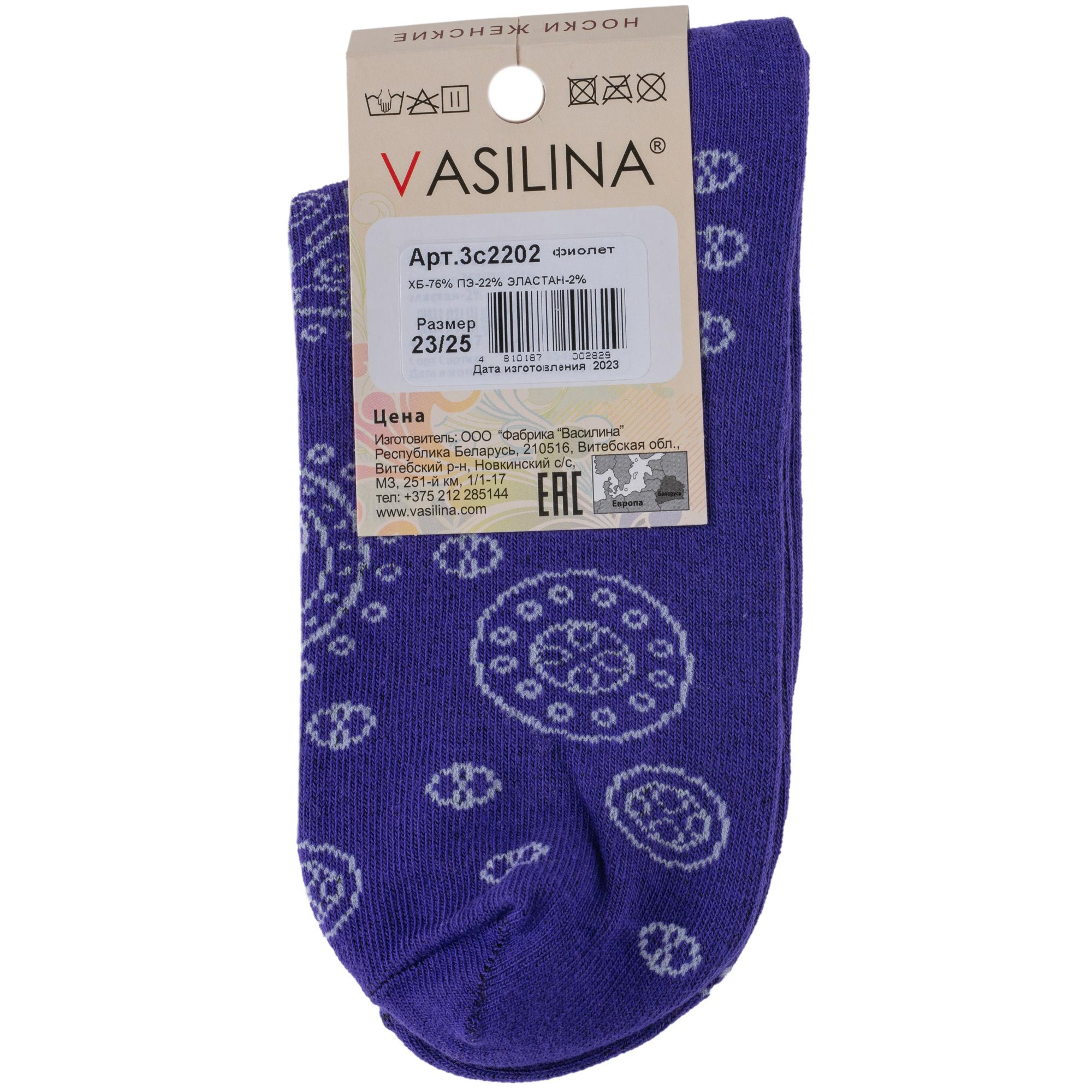 Круглогодичные укороченные женские носки, цвет фиолетовый, повседневные, шов обычный (не бесшовные), принт (рисунок): цветы/растения, орнамент, с узором, состав: 76% хлопок, 22% полиэстер, 2% эластан, арт. 3С2202. Производитель «ООО Фабрика Василина, Беларусь» под брендом «Vasilina».
