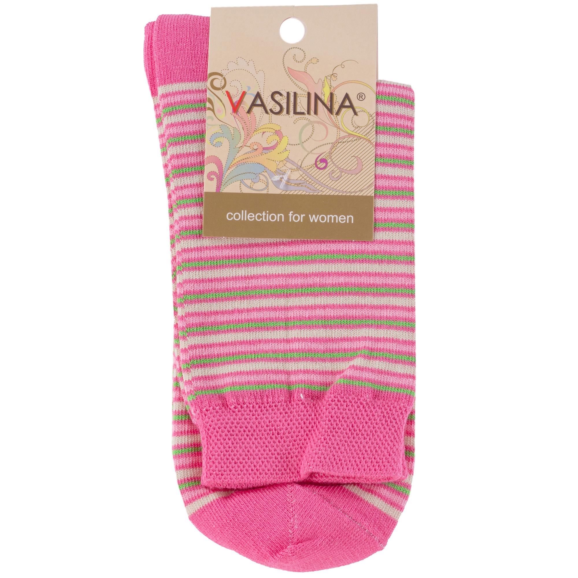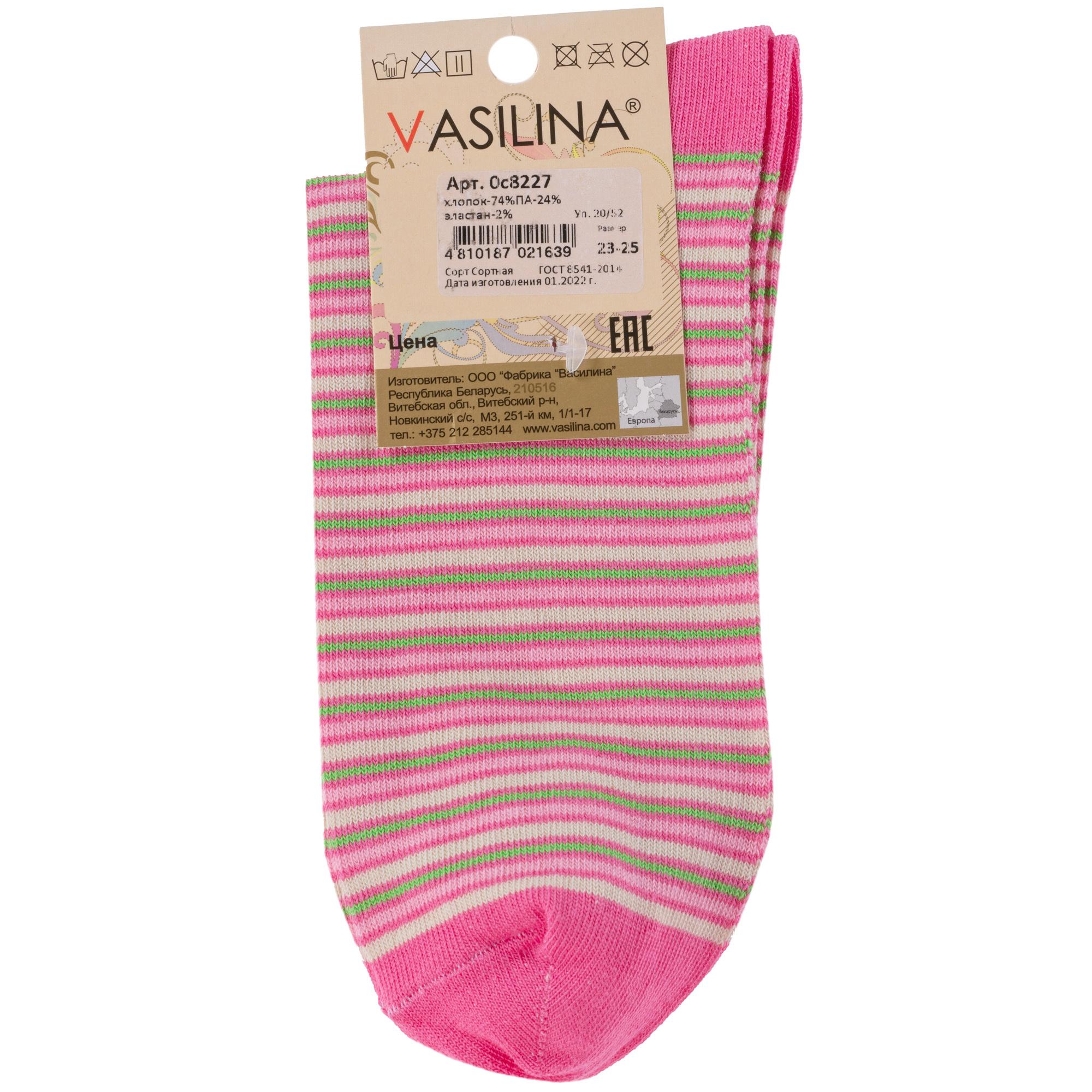 Круглогодичные укороченные женские носки, цвет розовый, классические, шов обычный (не бесшовные), принт (рисунок): полоски, с узором, состав: 74% хлопок, 24% полиэстер, 2% эластан, арт. 0С8227. Производитель «ООО Фабрика Василина, Беларусь» под брендом «Vasilina».