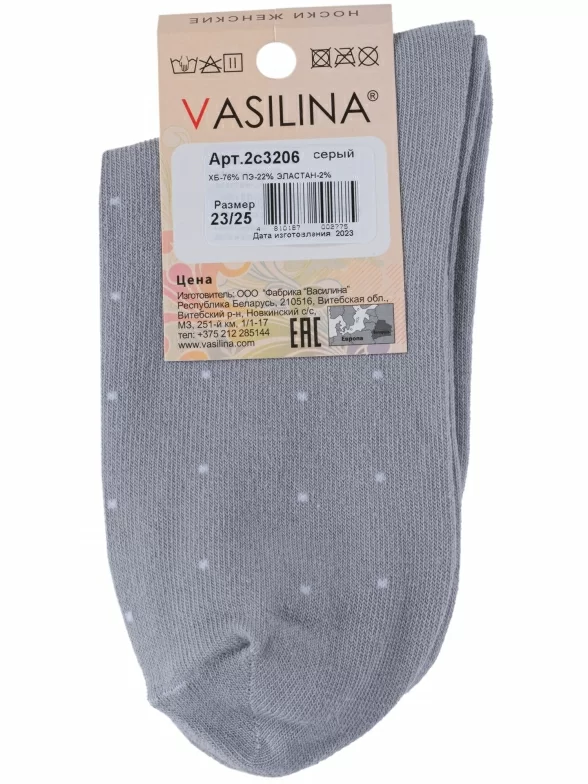 Круглогодичные укороченные женские носки, цвет серый, классические, шов обычный (не бесшовные), принт (рисунок): мелкий принт, горох / точка, с узором, состав: 76% хлопок, 22% полиэстер, 2% эластан, арт. 2С3206. Производитель «ООО Фабрика Василина, Беларусь» под брендом «Vasilina».