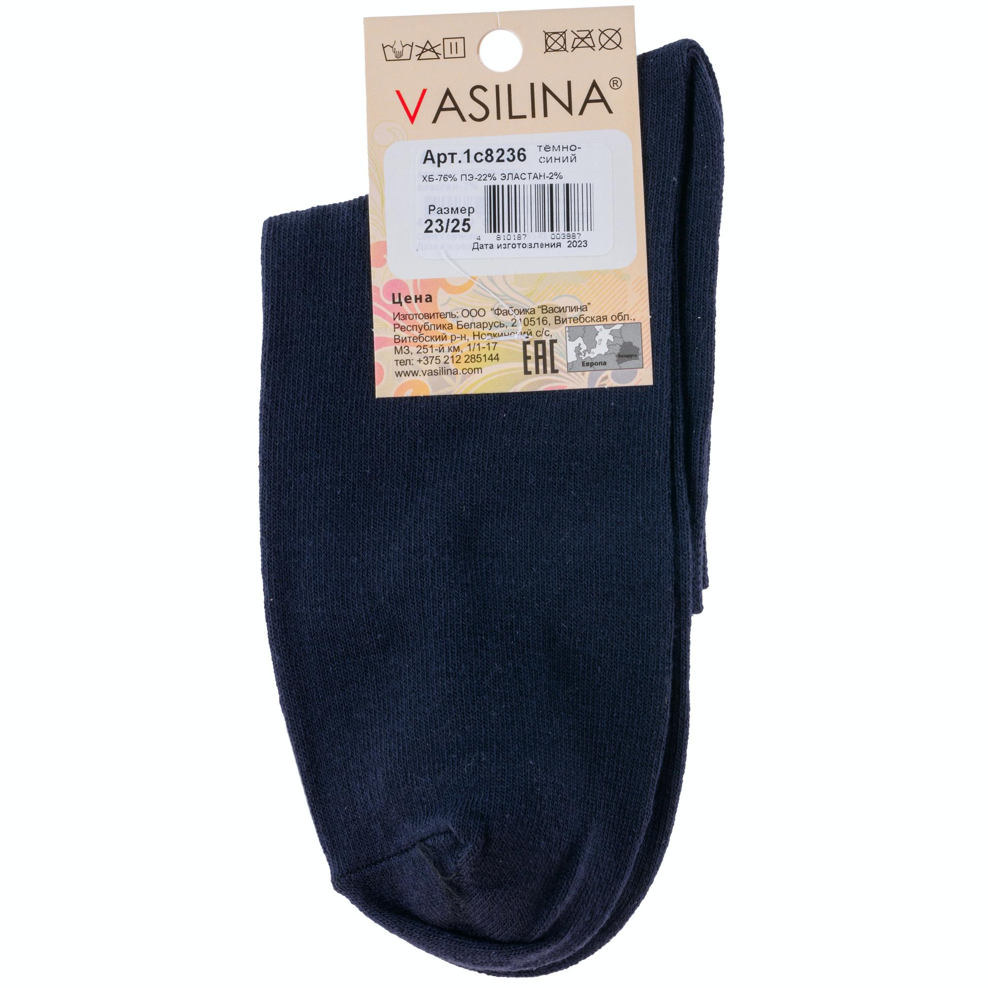 Круглогодичные укороченные женские носки, цвет темно-синий, классические, шов обычный (не бесшовные), принт (рисунок): однотонный, без рисунков/узоров, состав: 76% хлопок, 22% полиэстер, 2% эластан, арт. 1С8236. Производитель «ООО Фабрика Василина, Беларусь» под брендом «Vasilina».