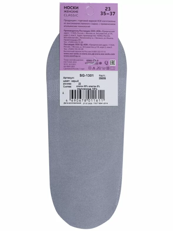 Пара подследников серого цвета арт. SG-1301 поставляется с фабричной этикеткой в обычном или курьер-пакете.