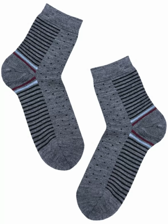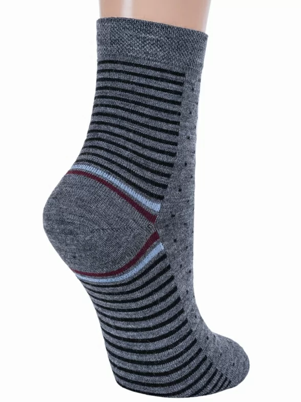 Теплые женские носки классической длины. Полушерстяная модель порадует оригинальным узором и подарит комфорт и тепло. Подошва носков оформлена чередующимися полосками, а подъем – контрастной “мушкой”. Мягкая резинка не оставляет следов на коже.