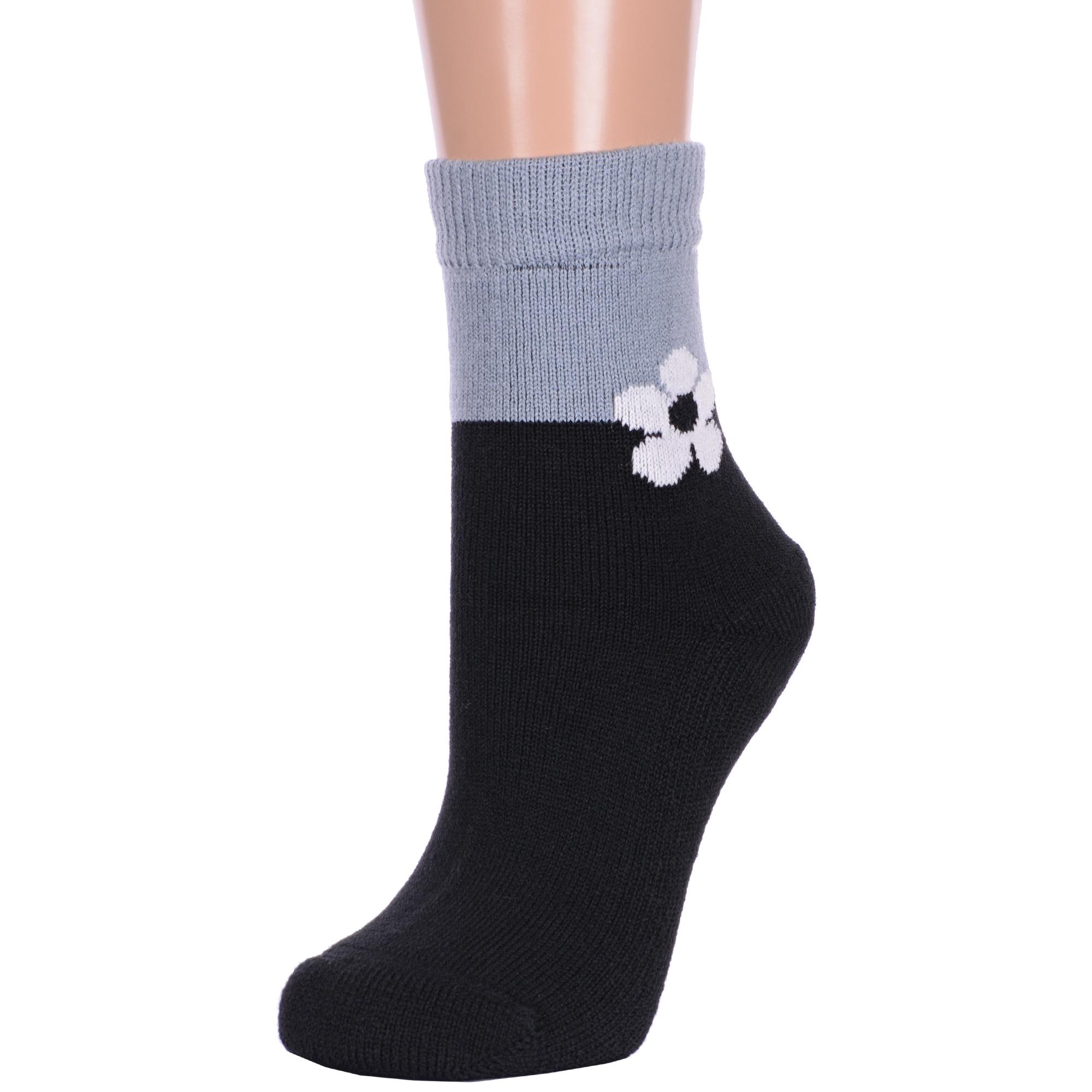 Зимние укороченные женские носки, цвет черный, теплые, повседневные, с махровым следом, шов плоский, принт (рисунок): цветы / растения, с узором, состав: 85% полушерсть, 10% полиамид, 5% лайкра, арт. В14М. Производитель «ИП Мурзаков В.А., Ставропольский край, Россия» под брендом «Lorenzline».