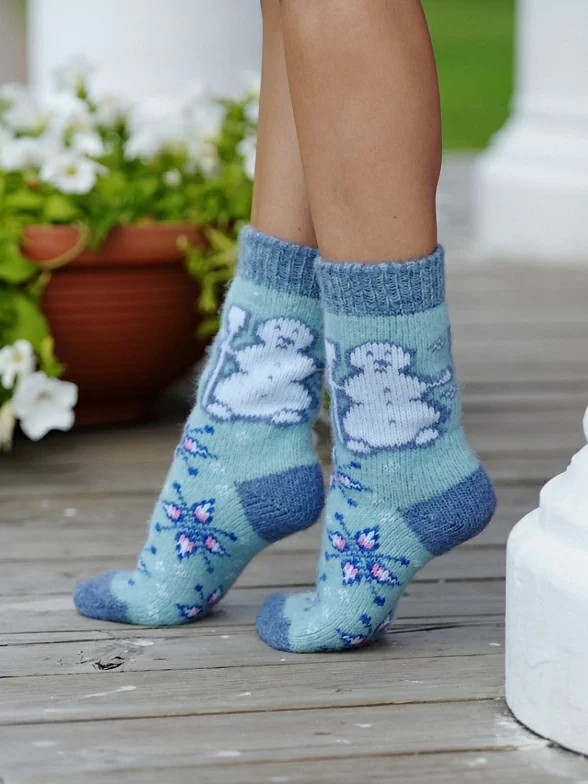 Бабушкины носки сделаны из мягкой новозеландской овечьей шерсти, козьей шерсти и шерсти мериносов. В состав пряжи добавлено небольшое количество полиамида, который делает носки прочнее Для производства используются вязальные машины BUSI GIOVANNI. Модель украшена яркими узорами изображающими снежинки и снеговиков.