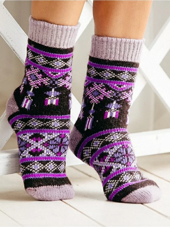 Бабушкины носки изготовлены из мягкой новозеландской овечьей шерсти, козьей шерсти и шерсти мериносов. В состав пряжи включено небольшое количество полиамида, который делает носки прочнее Для производства используются итальянские станки BUSI GIOVANNI. Модель украшена яркими узорами и орнаментами.