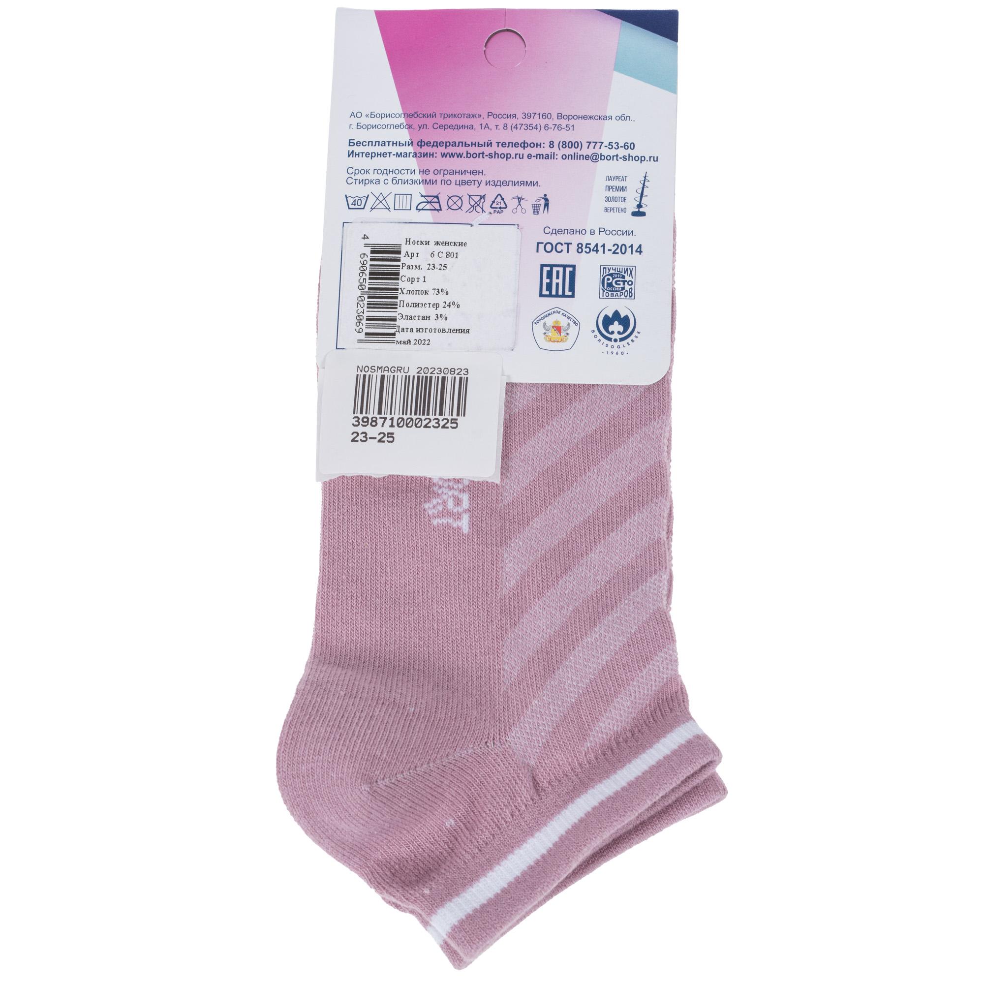 Круглогодичные короткие женские носки, цвет розовый, спортивные, в сеточку, шов обычный (не бесшовные), принт (рисунок): контрастные пятка/мысок/резинка, зигзаг / молния, с узором, состав: 73% хлопок, 24% полиэстер, 3% эластан, арт. 6С801. Производитель «АО Борисоглебский трикотаж, Воронежская обл, Россия» под брендом «Борисоглебский трикотаж».