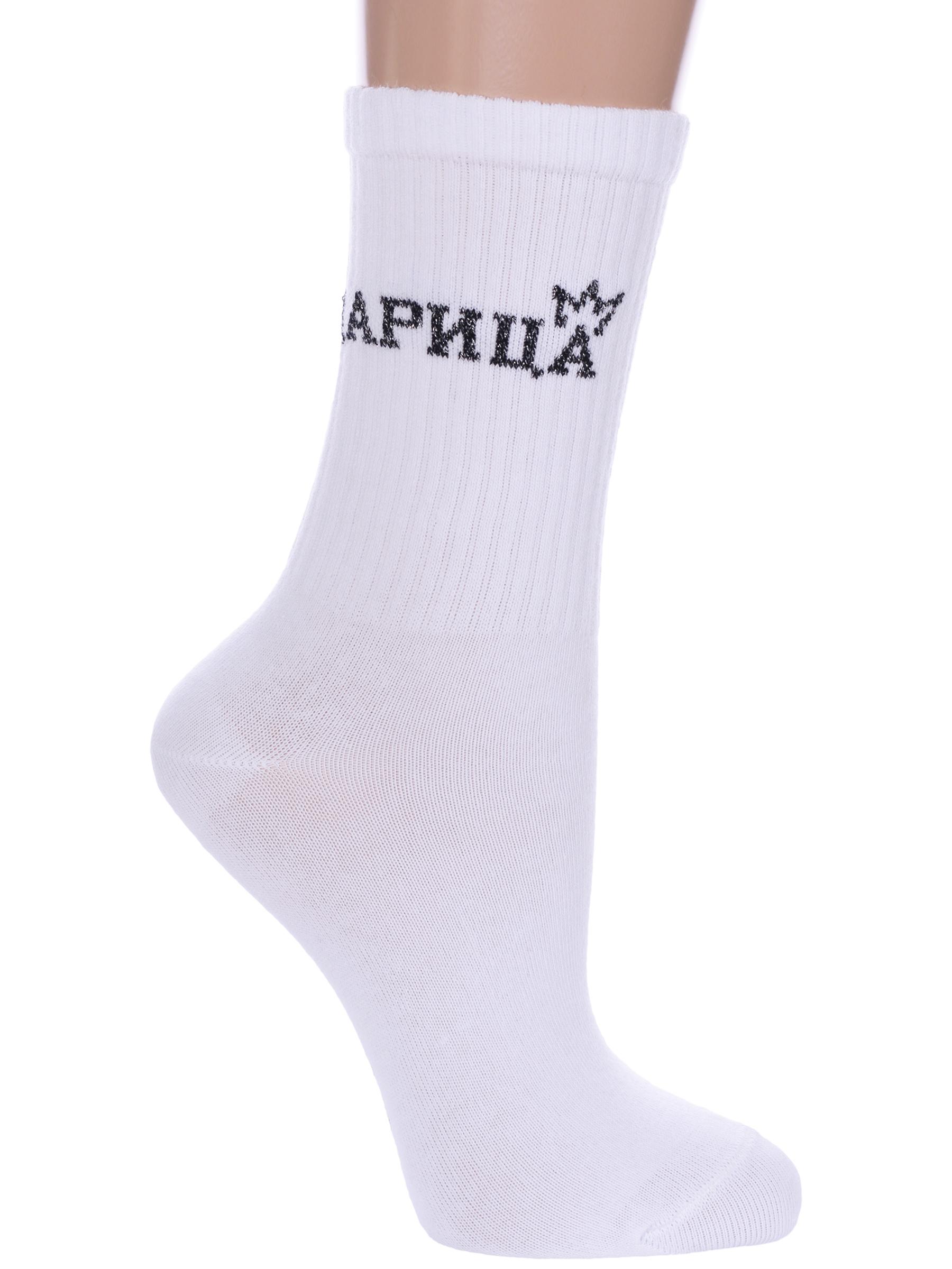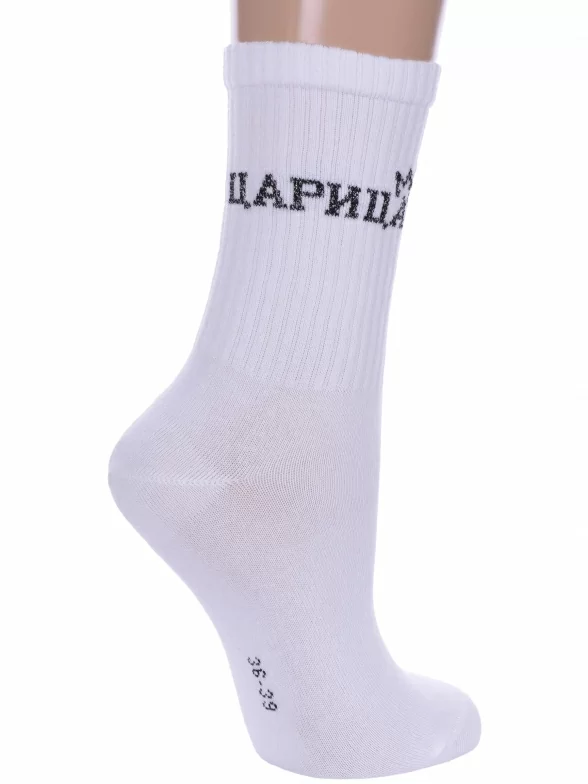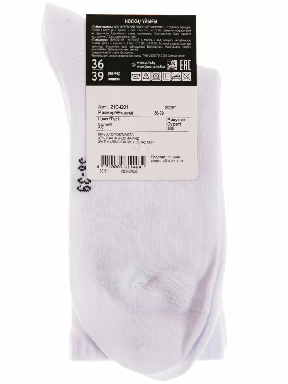 Круглогодичные средней длины женские носки, цвет белый, спортивные, шов плоский, принт (рисунок): надписи, в рубчик, состав: 60% хлопок, 37% полиамид, 3% эластан, арт. 21С4201. Производитель «Брестский чулочный комбинат ОАО, Беларусь» под брендом «Брестские (бчк)».