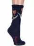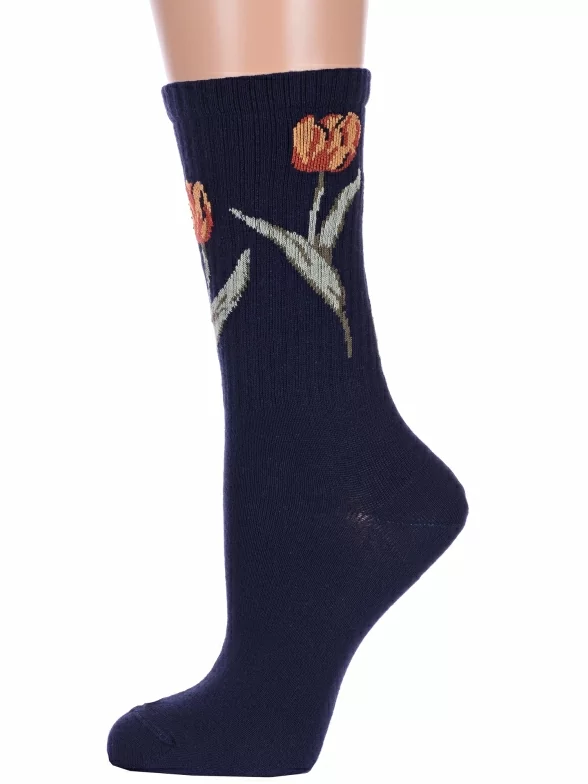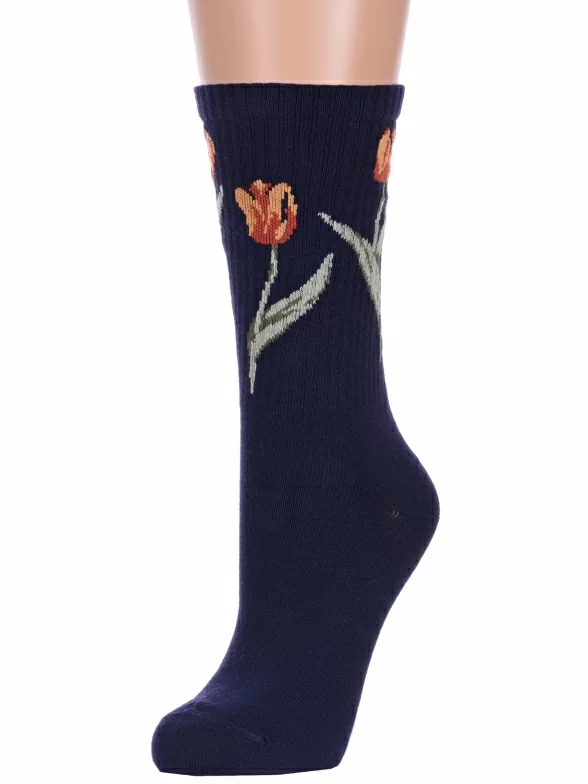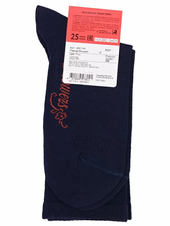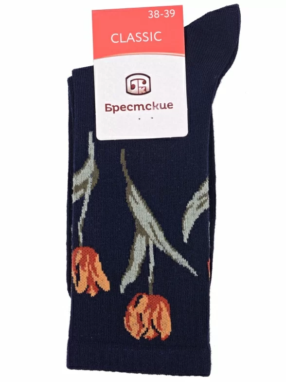 Круглогодичные высокие женские носки, цвет темно-синий, спортивные, повседневные, шов плоский, принт (рисунок): цветы / растения, в рубчик, с узором, состав: 60% хлопок, 37% полиамид, 3% эластан, арт. 20С1141. Производитель «Брестский чулочный комбинат ОАО, Беларусь» под брендом «Брестские (бчк)».