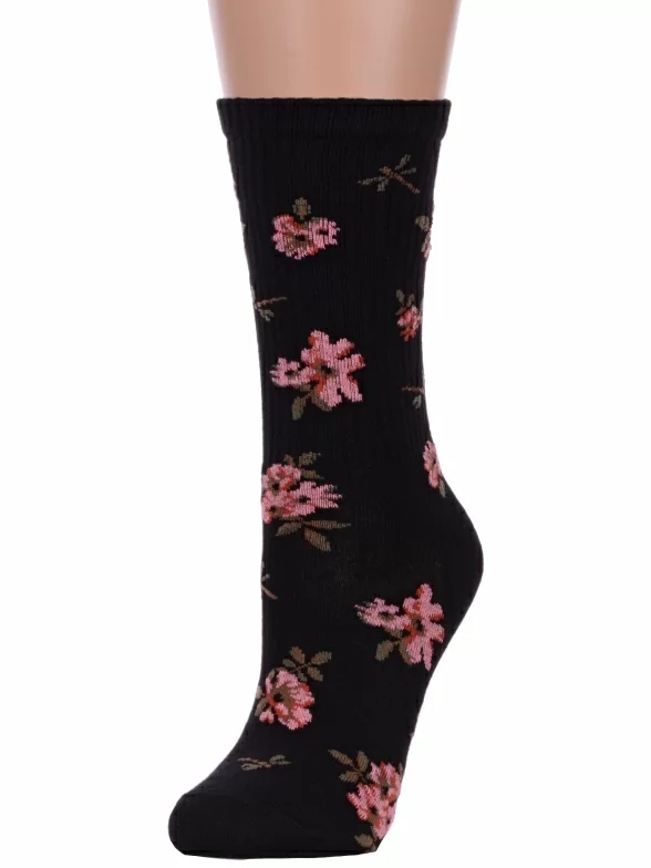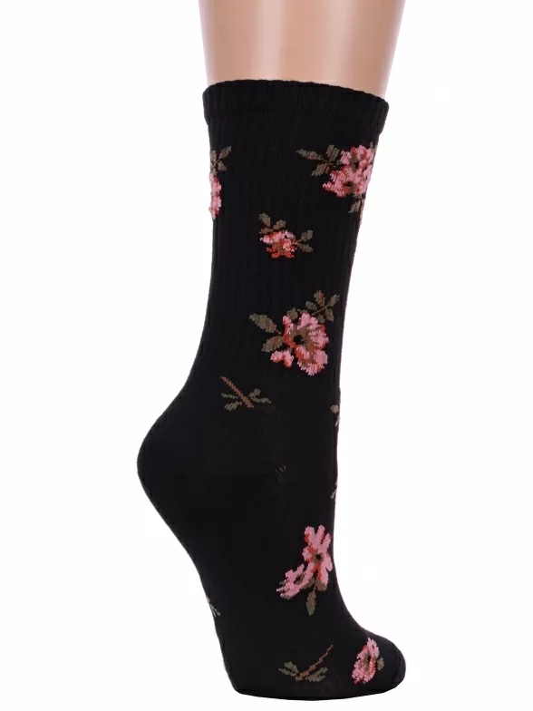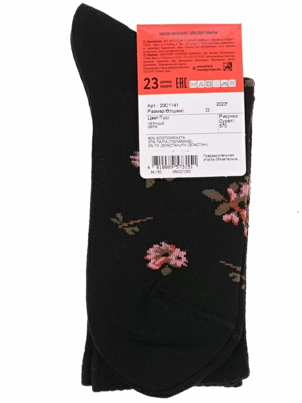 Круглогодичные высокие женские носки, цвет черный, спортивные, повседневные, шов плоский, принт (рисунок): цветы / растения, в рубчик, с узором, состав: 60% хлопок, 37% полиамид, 3% эластан, арт. 20С1141. Производитель «Брестский чулочный комбинат ОАО, Беларусь» под брендом «Брестские (бчк)».