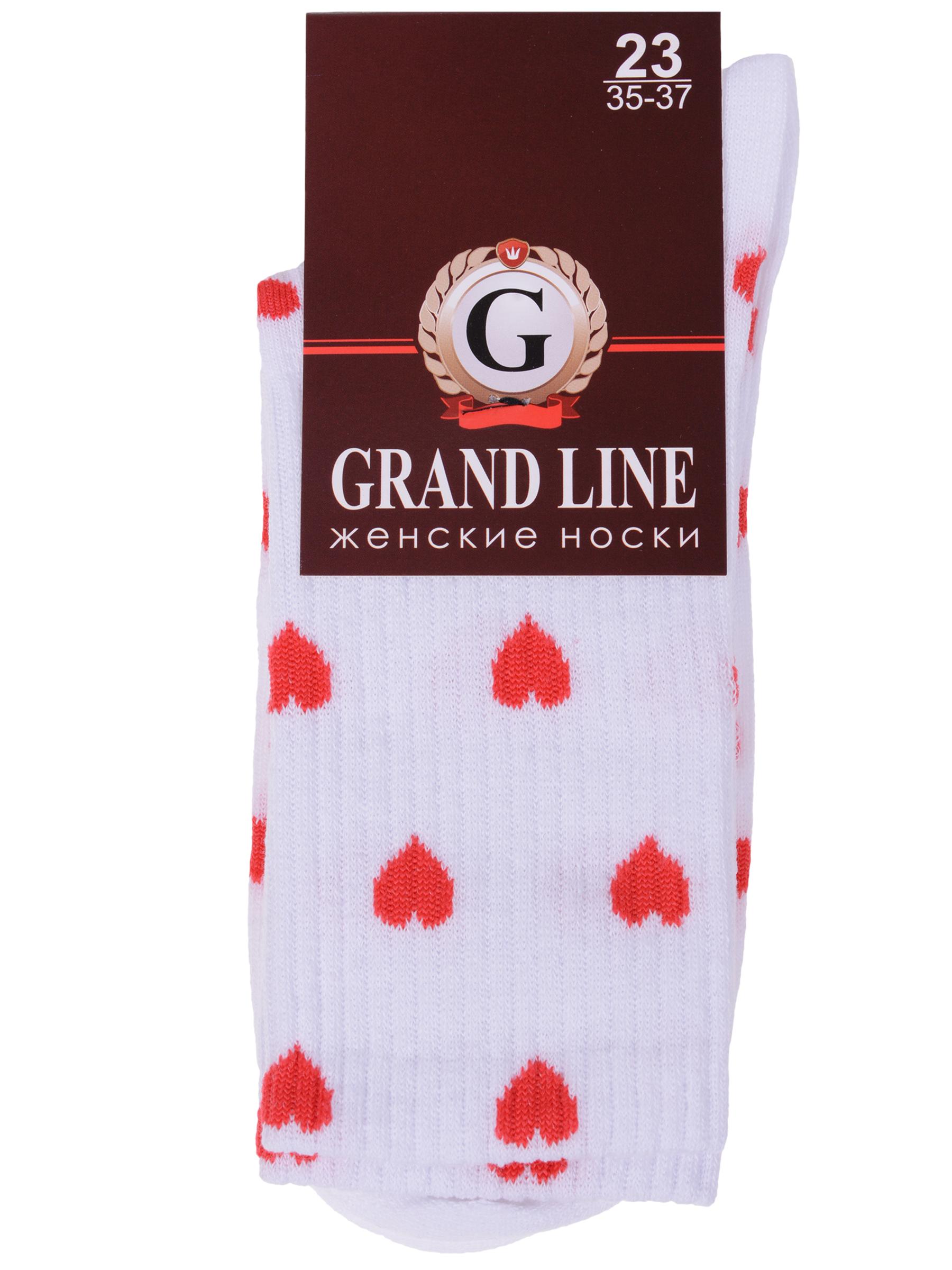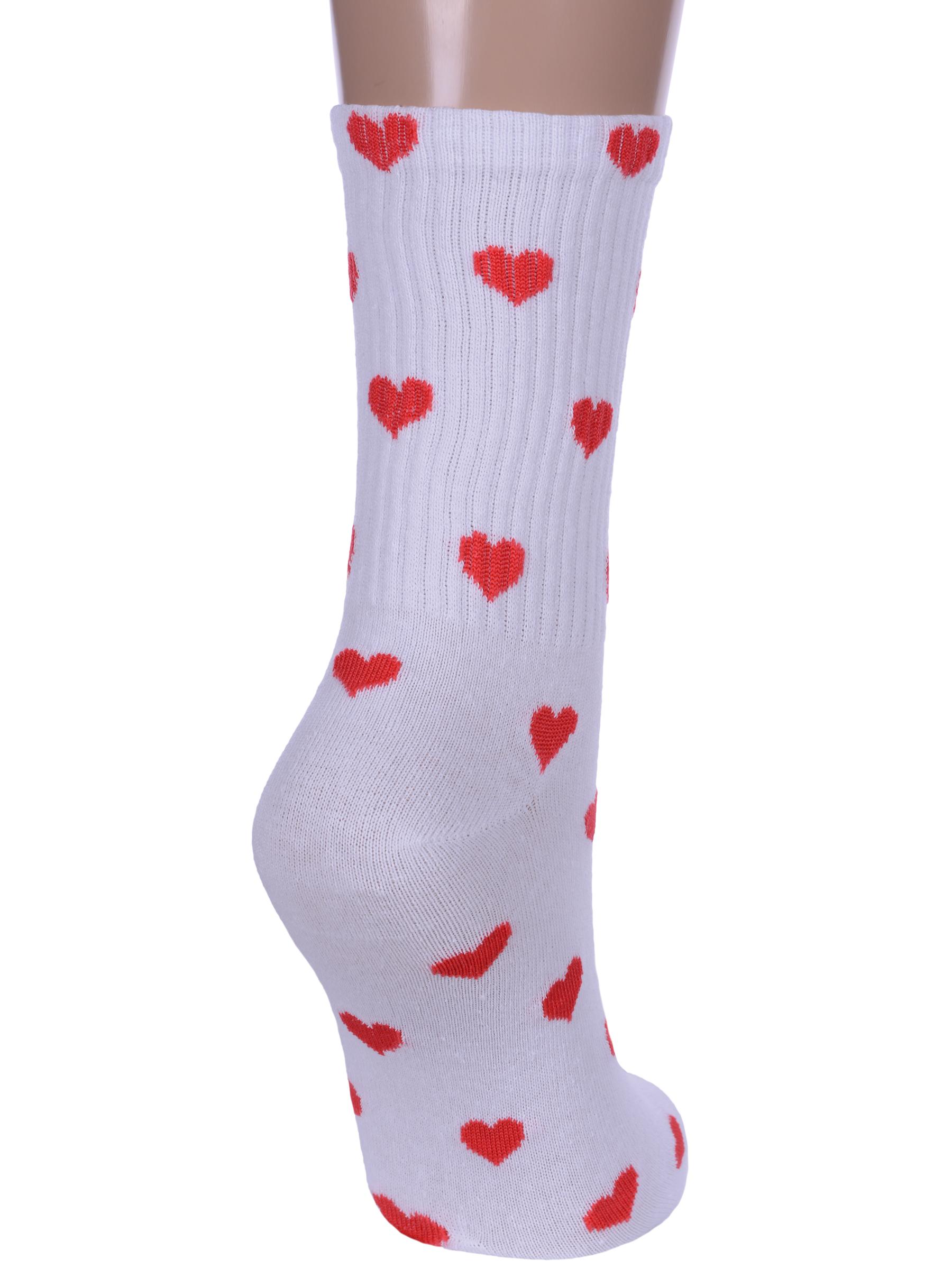 Круглогодичные средней длины женские носки, цвет белый, спортивные, шов обычный (не бесшовные), принт (рисунок): сердечки / поцелуи / любовь, состав: 80% хлопок, 17% полиамид, 3% эластан, арт. Ж-23. Производитель «ООО Производственная компания "ДСМ", Россия» под брендом «Grand line».