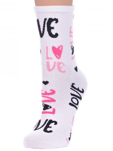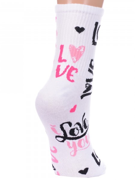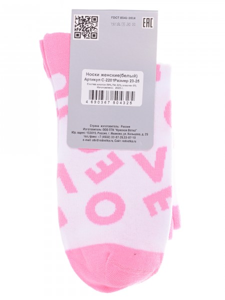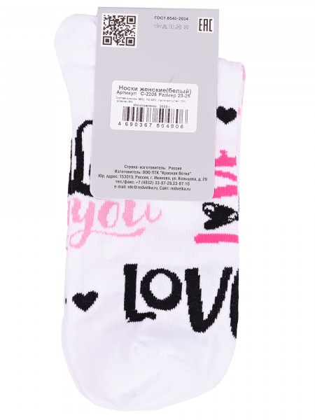 Круглогодичные укороченные женские носки, цвет белый, спортивные, возможно бесшовные, принт (рисунок): сердечки / поцелуи / любовь, полоски, в рубчик, небольшой рисунок, состав: 67% хлопок, 24% полиамид, 7% эластан, 2% полипропилен, арт. С-1225. Производитель «КРАСНАЯ ВЕТКА» Россия под брендом «Красная ветка».