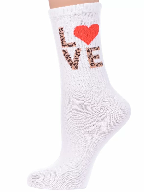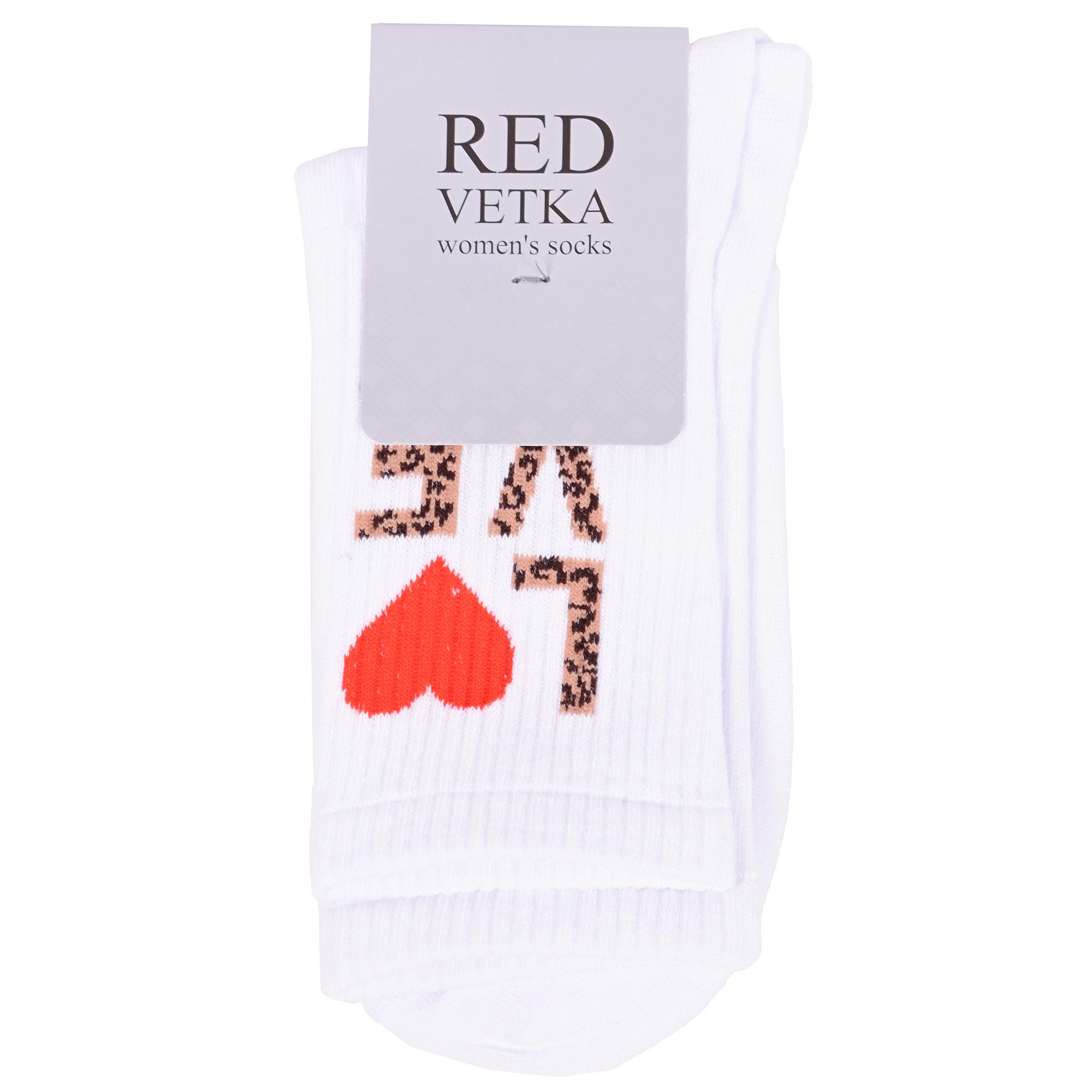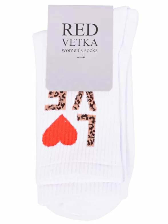 Круглогодичные укороченные женские носки, цвет белый, спортивные, повседневные, возможно бесшовные, принт (рисунок): сердечки / поцелуи / любовь, надписи, в рубчик, с узором, крупные контрастные рисунки, состав: 73% хлопок, 23% полиамид, 4% эластан, арт. С-2225. Производитель «КРАСНАЯ ВЕТКА» Россия под брендом «Красная ветка».