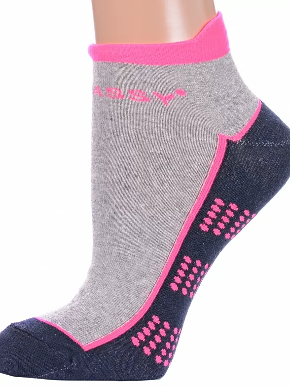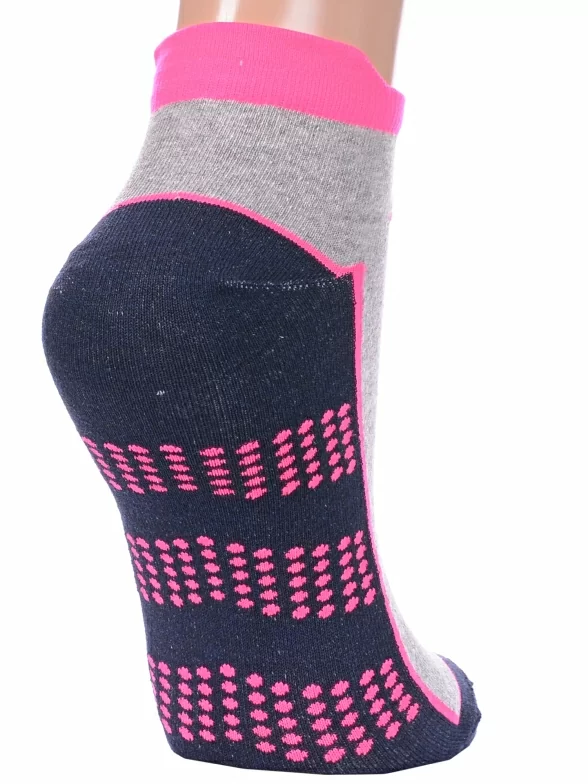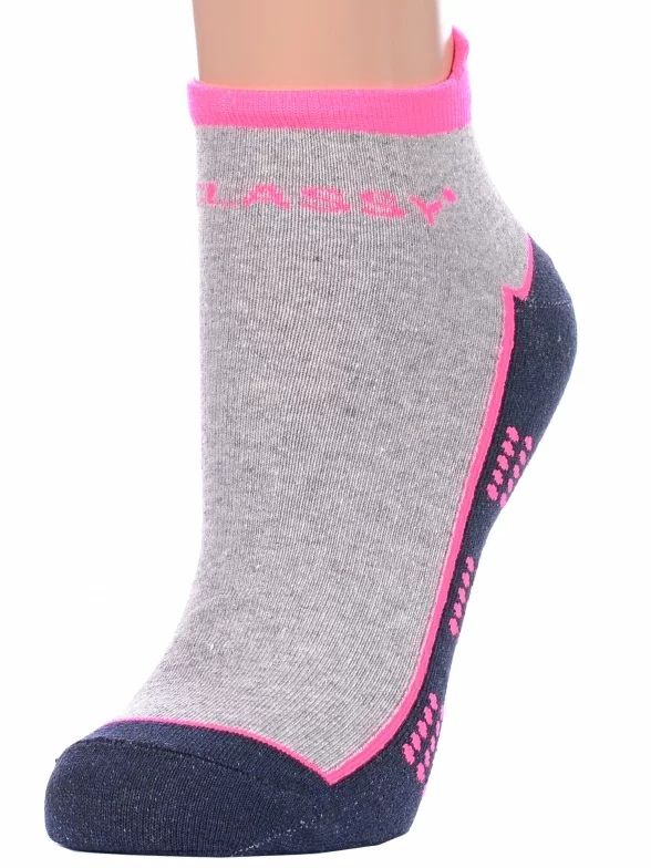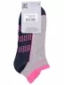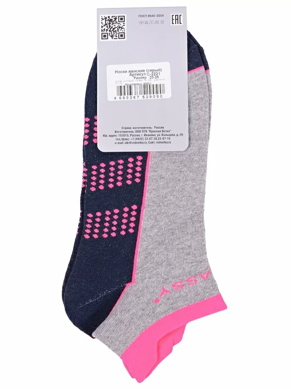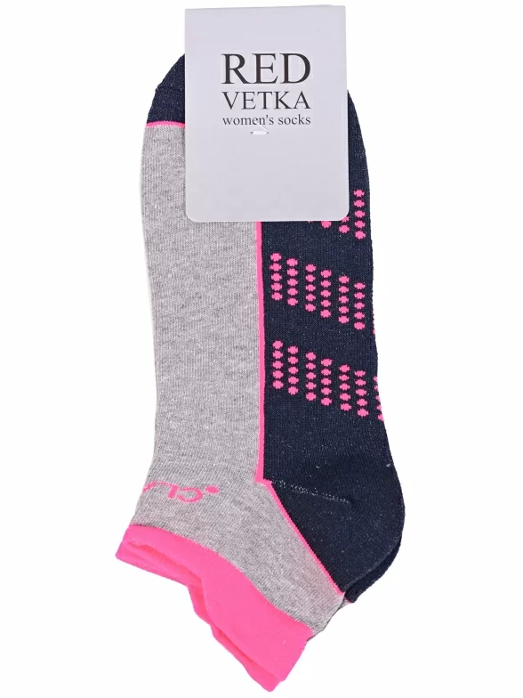 Круглогодичные короткие женские носки, цвет серый-многоцветные (мультиколор), спортивные, возможно бесшовные, принт (рисунок): надписи, контрастные пятка / мысок / резинка, с узором, состав: 42% хлопок, 28% полиэстер, 16% полиамид, 10% полипропилен, 4% эластан, арт. С-2231. Производитель «КРАСНАЯ ВЕТКА» Россия под брендом «Красная ветка».