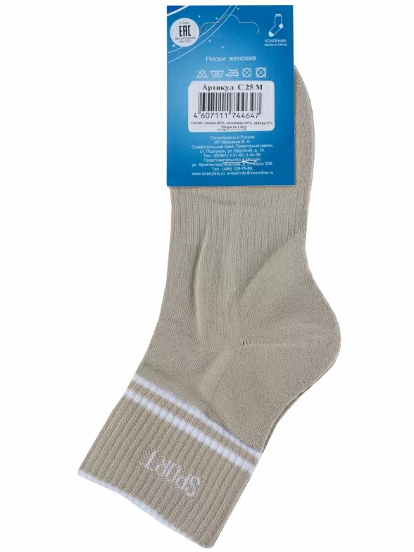 Круглогодичные укороченные женские носки, цвет бежевый, спортивные, с махровым следом, шов обычный (не бесшовные), принт (рисунок): спортивные, с узором, состав: 85% хлопок, 10% полиамид, 5% эластан (лайкра), арт. С25М. Производитель «ИП Мурзаков В.А., Ставропольский край, Россия» под брендом «Lorenzline».
