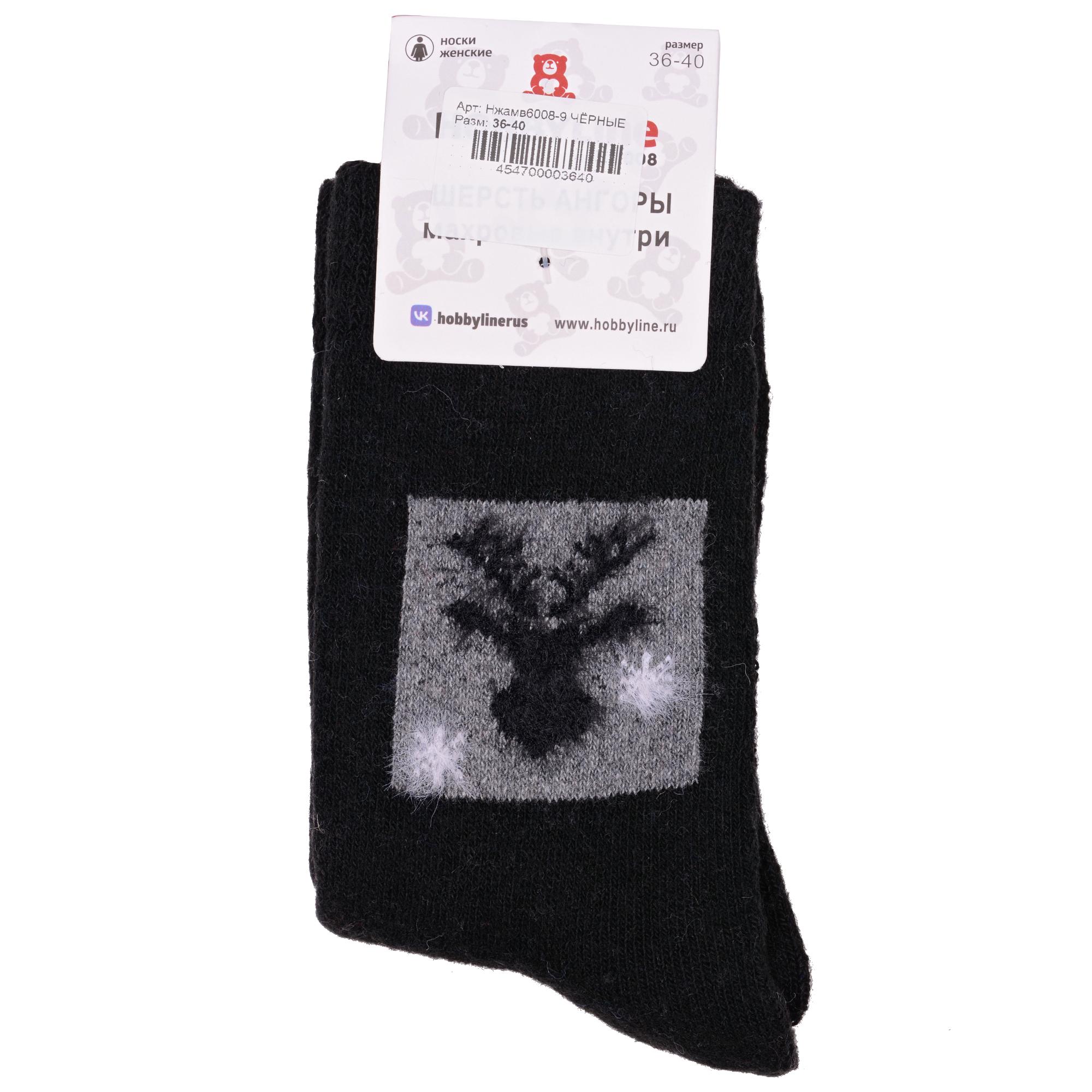 Зимние средней длины женские носки, цвет черный, теплые, повседневные, махровые, шов обычный (не бесшовные), принт (рисунок): пушистый, новый год, животные, с узором, состав: 35% вискоза, 20% шерсть, 10% ангора, 30% полиэстер, 5% эластан, арт. Нжамв6008-9. Производитель «Китай, страна бренда - Россия» под брендом «Hobby line».