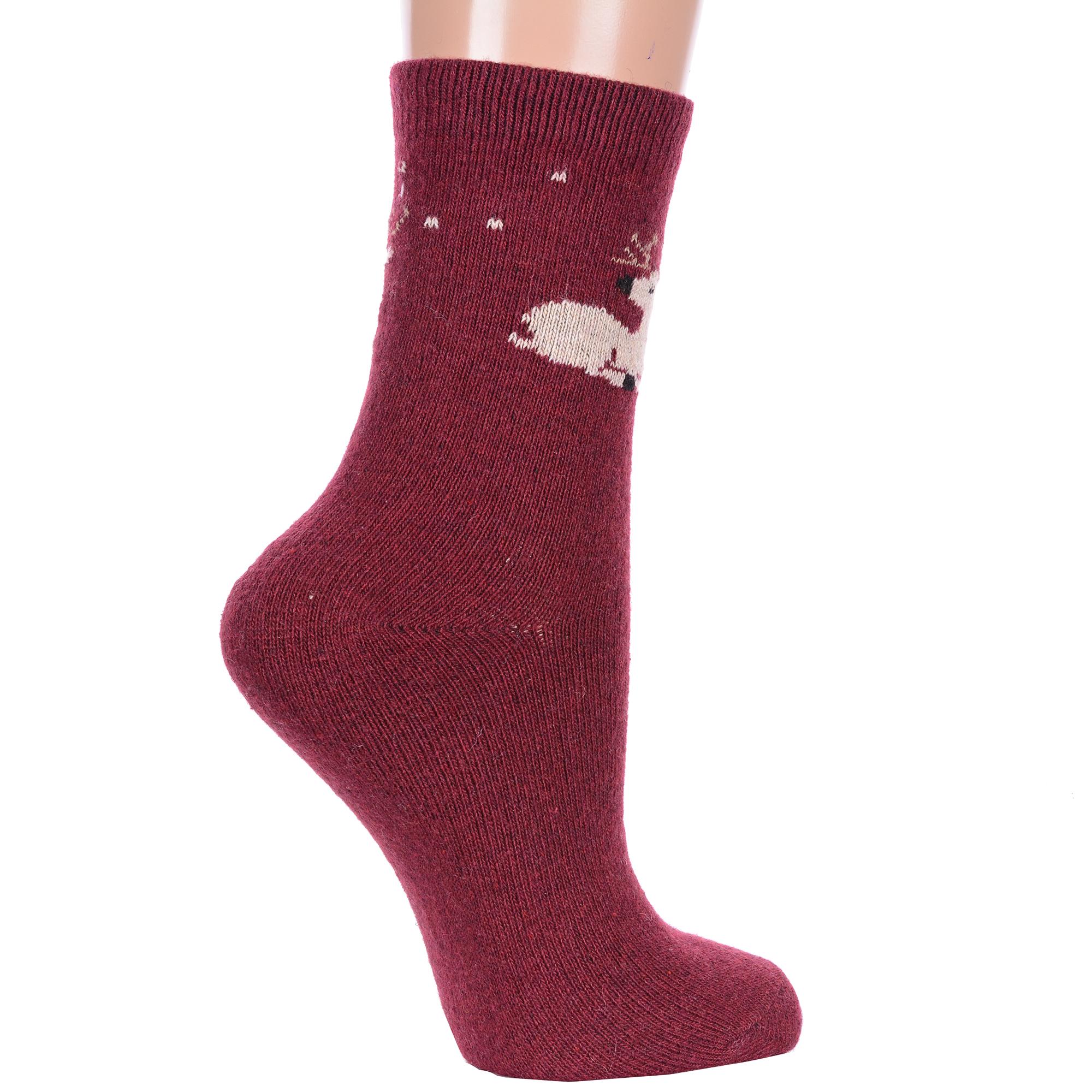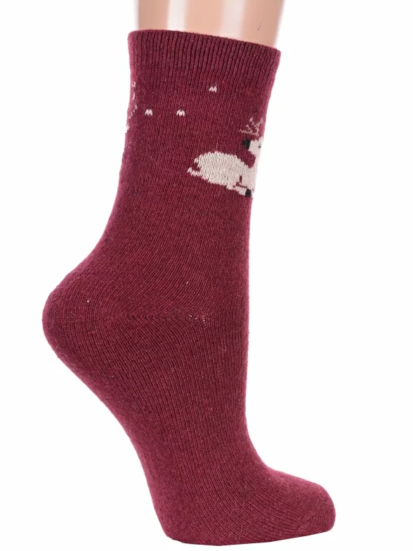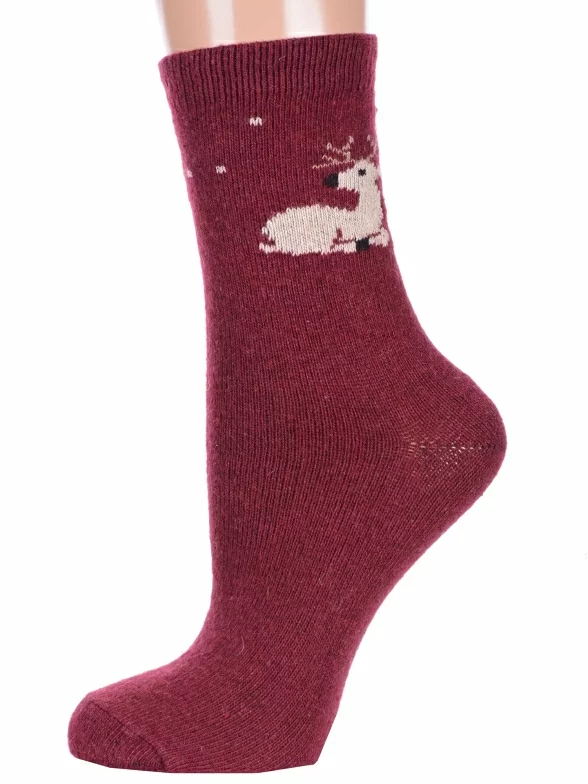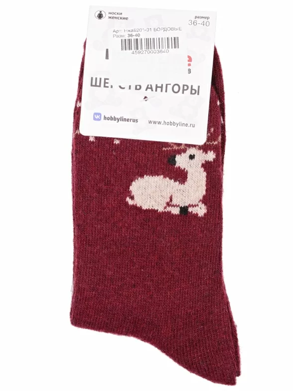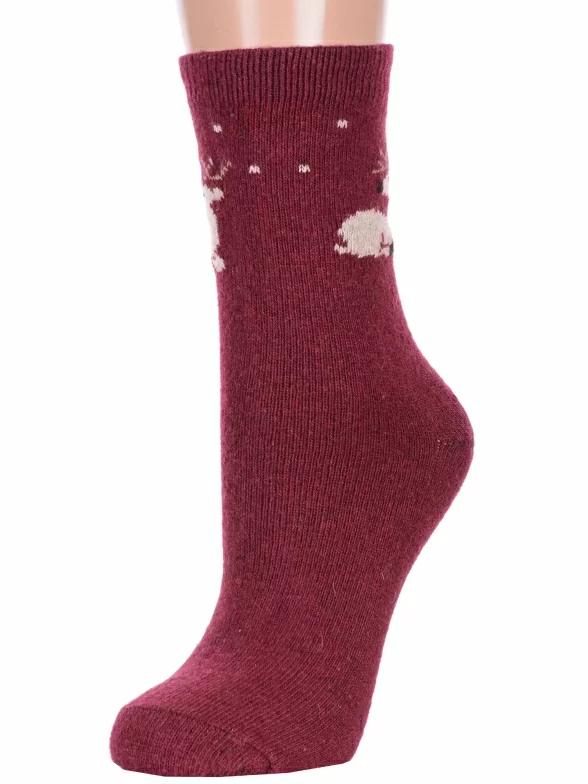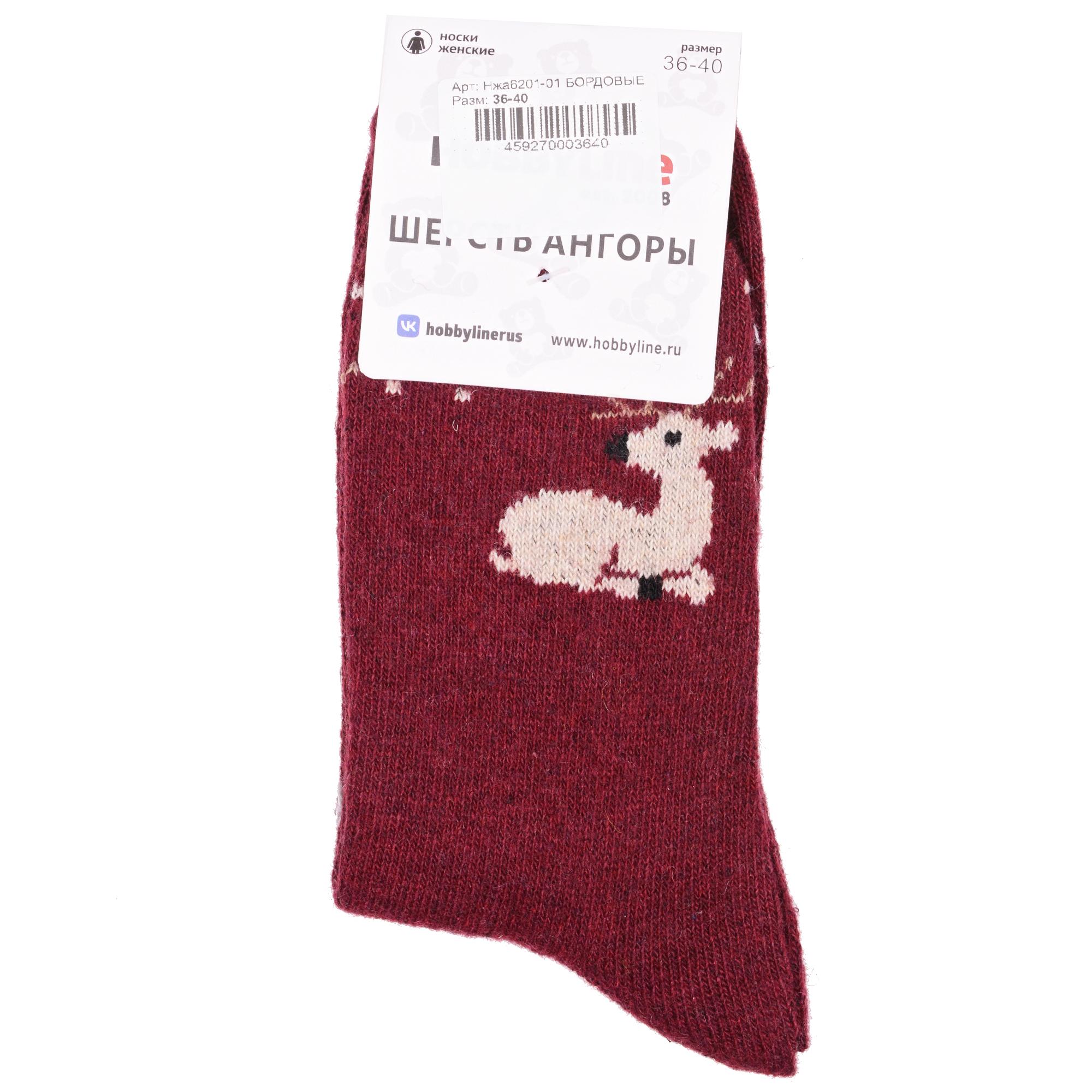 Зимние укороченные женские носки, цвет бордовый, теплые, повседневные, шов обычный (не бесшовные), принт (рисунок): новый год, животные, с узором, состав: 35% вискоза, 20% шерсть, 10% ангора, 30% полиэстер, 5% эластан, арт. Нжа6201-01. Производитель «Китай, страна бренда - Россия» под брендом «Hobby line».