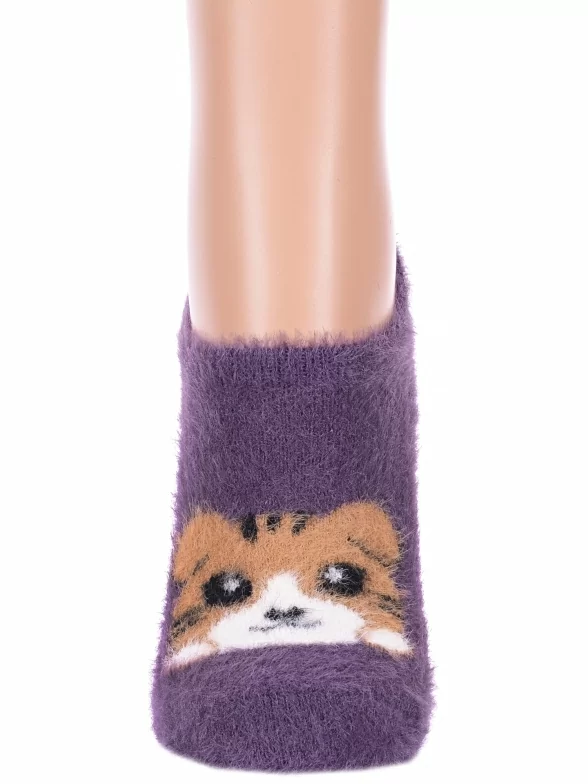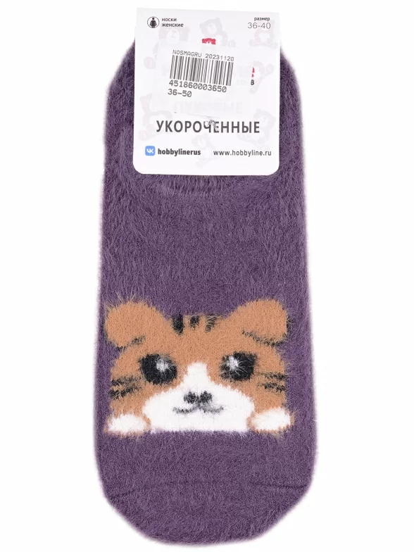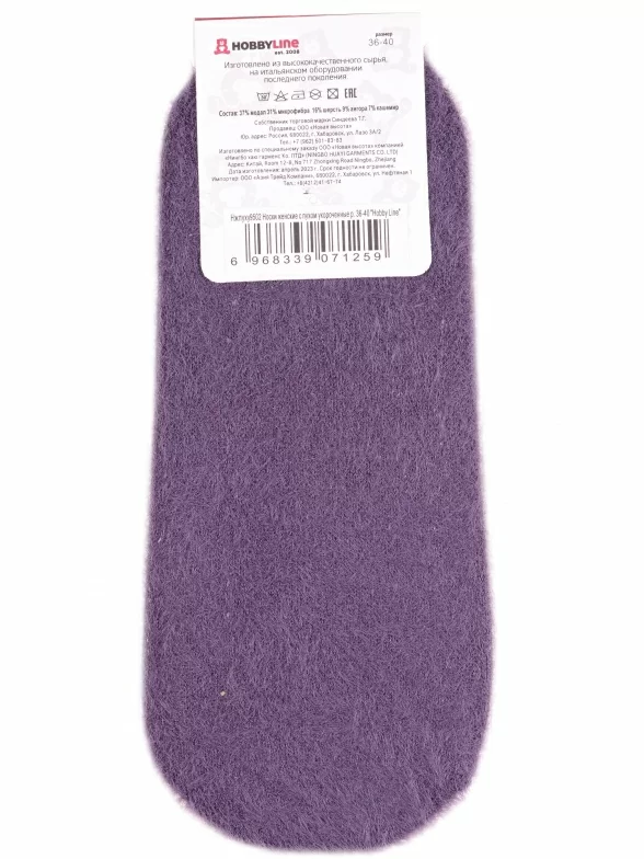 Межсезонные или зимние ультракороткие женские носки, цвет фиолетовый, теплые, с принтом, состав: 37% модал, 31% микрофибра, 16% шерсть, 9% ангора, 7% кашемир, арт. Нжпуху9502. Производитель «Китай, страна бренда - Россия» под брендом «Hobby line».