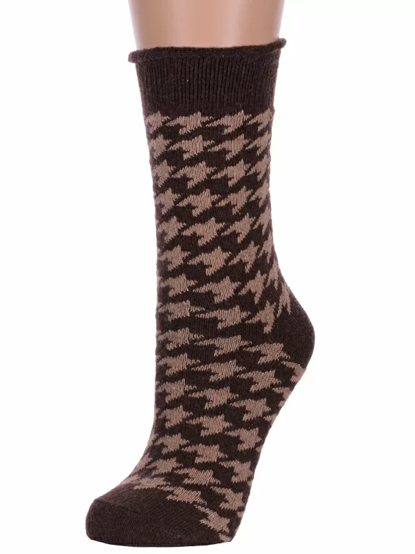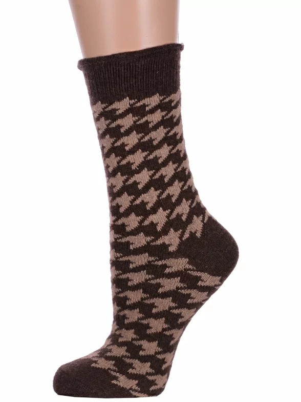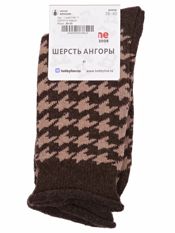 Зимние средней длины женские носки, цвет коричневый, теплые, повседневные, медицинские, шов обычный (не бесшовные), принт (рисунок): елочка / гусиная лапка, с узором, состав: 35% вискоза, 20% шерсть, 10% ангора, 30% полиэстер, 5% эластан, арт. Нжа6199-11. Производитель «Китай, страна бренда - Россия» под брендом «Hobby line».