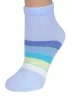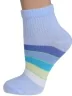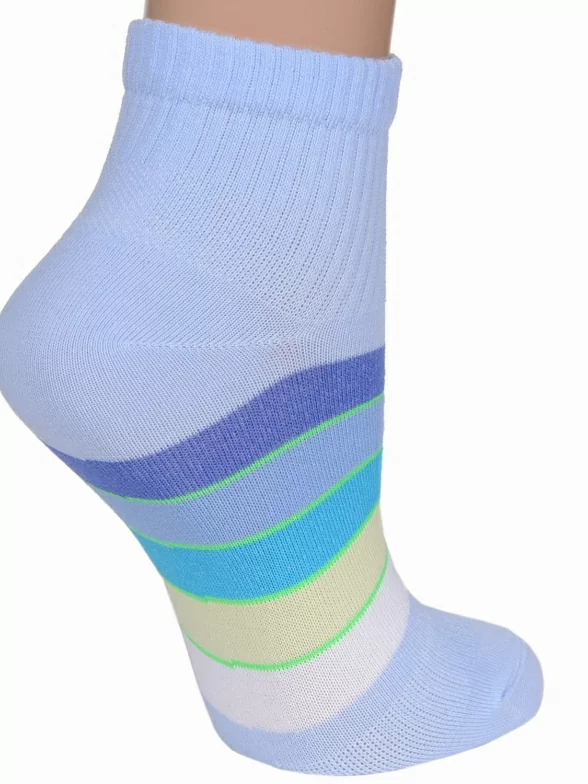 Укороченные женские носки связаны в полоску различных цветов на голубом фоне. Модель сделана из пряжи на основе хлопка.