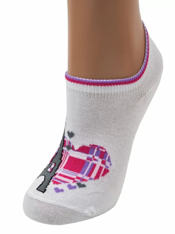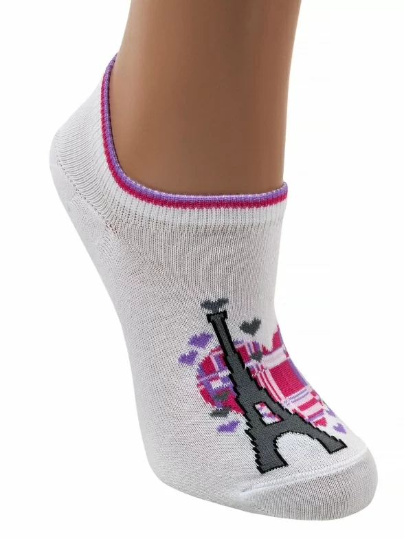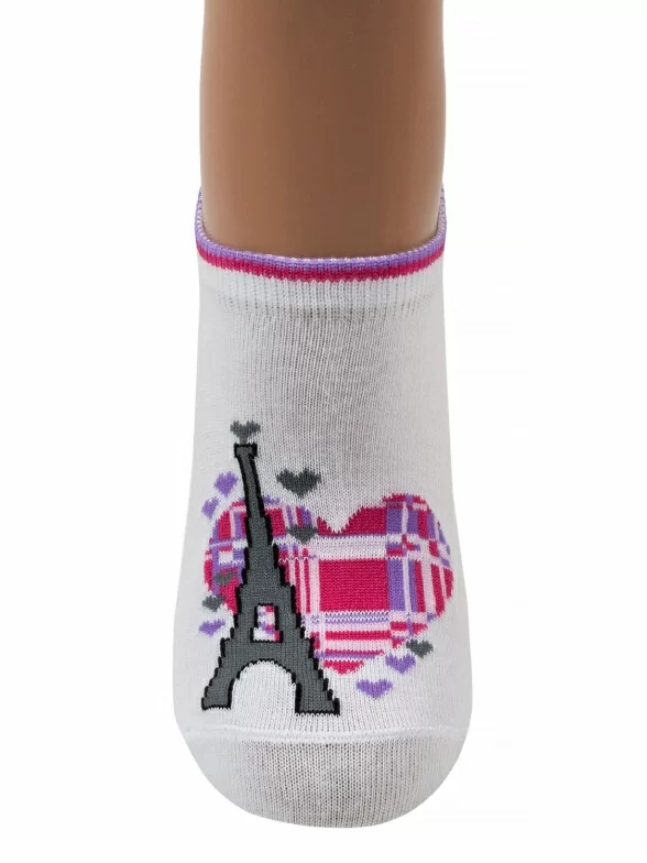 Короткие женские носки Красная ветка. Изготовлены из хлопка, с добавлением полиамида и эластана. Отлично сочетаются с повседневной одеждой, а так же спортивной обувью. Особенность модели - красивый принт с романтичным Парижем.
