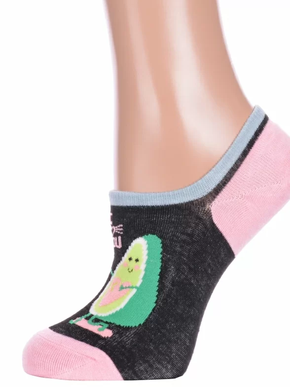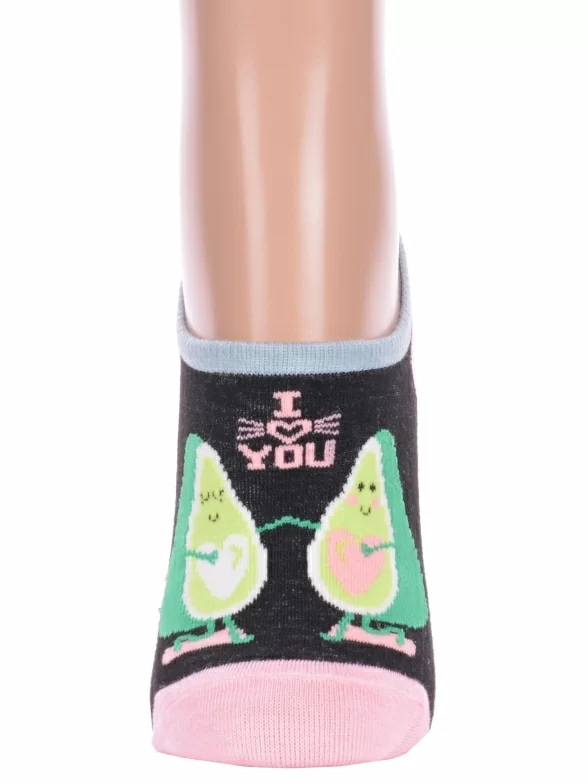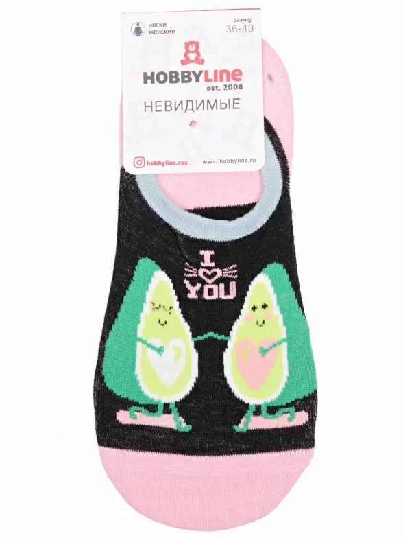 Летние ультракороткие женские носки, цвет розовый-черный, с силиконовой вставкой, повседневные, шов обычный (не бесшовные), принт (рисунок): овощи / фрукты / ягоды, сердечки / поцелуи / любовь, надписи, контрастные пятка / мысок / резинка, с узором, крупные контрастные рисунки, состав: 75% хлопок, 23% полиамид, 2% эластан, арт. ННЖ18-09-01. Производитель «Китай, страна бренда - Россия» под брендом «Hobby line».