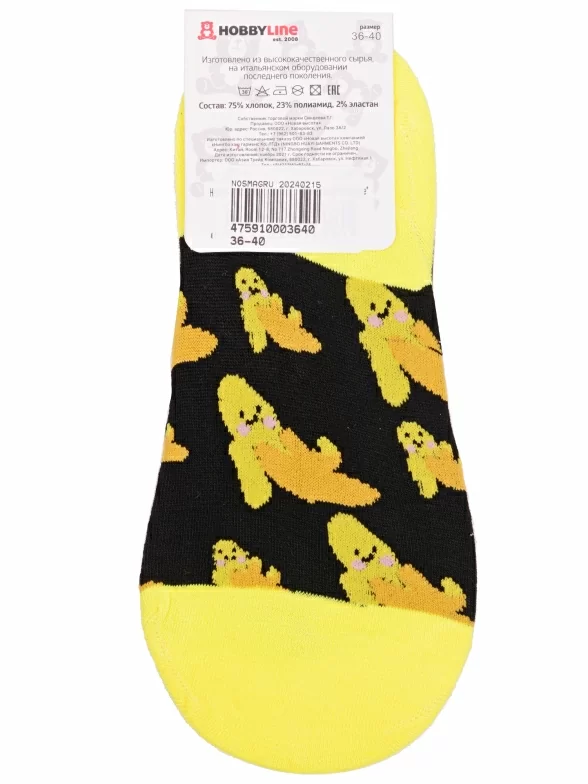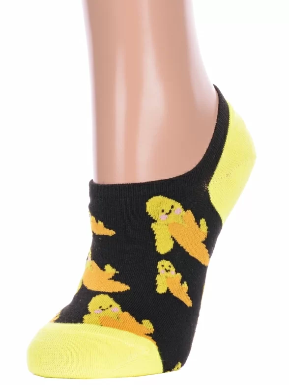 Летние ультракороткие женские носки, цвет желтый-черный, с силиконовой вставкой, повседневные, шов обычный (не бесшовные), принт (рисунок): овощи / фрукты / ягоды, контрастные пятка / мысок / резинка, с узором, состав: 75% хлопок, 23% полиамид, 2% эластан, арт. ННЖ18-09-03-02. Производитель «Китай, страна бренда - Россия» под брендом «Hobby line».