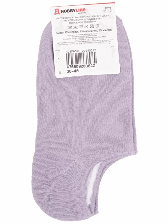 Летние ультракороткие женские носки, цвет серый, классические, шов обычный (не бесшовные), принт (рисунок): однотонный, без рисунков/узоров, состав: 75% хлопок, 23% полиамид, 2% эластан, арт. Нжу562-12. Производитель «Китай, страна бренда - Россия» под брендом «Hobby line».