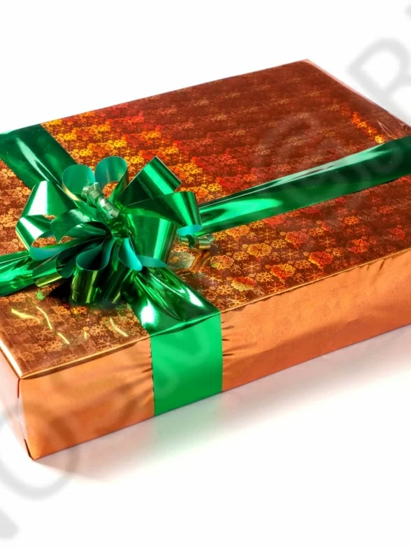 - кейс носков оборачивается в подарочную упаковку в золотую пленку "металл", зеленые ленты.