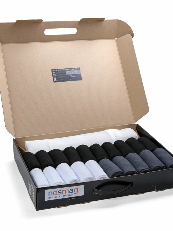Носки свернуты аккуратными рулончиками без фабричных этикеток внутри фирменного кейса с пластиковой ручкой.