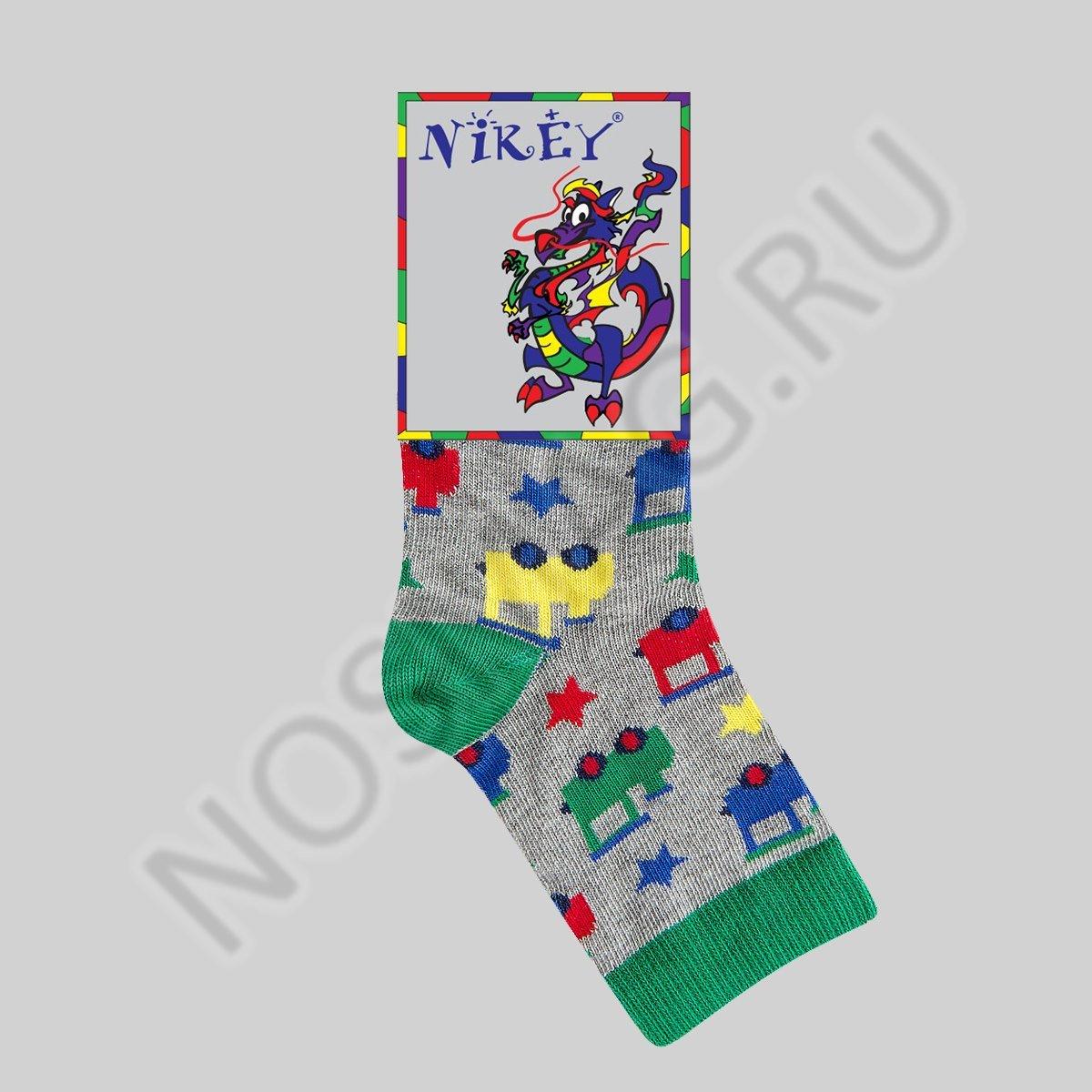 Стильные носки для мальчиков. Модель выполнена в сочетании меланжевого серого и однотонного зелёного цветов. Носки декорированы принтом с разнообразными машинами.