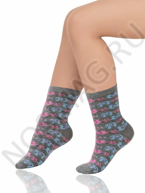 Яркие и стильные носки стандартной длины для девочек. Они украшены принтом с разноцветными слониками. Носок и пятка - однотонные. Модель отличается удобными манжетами.