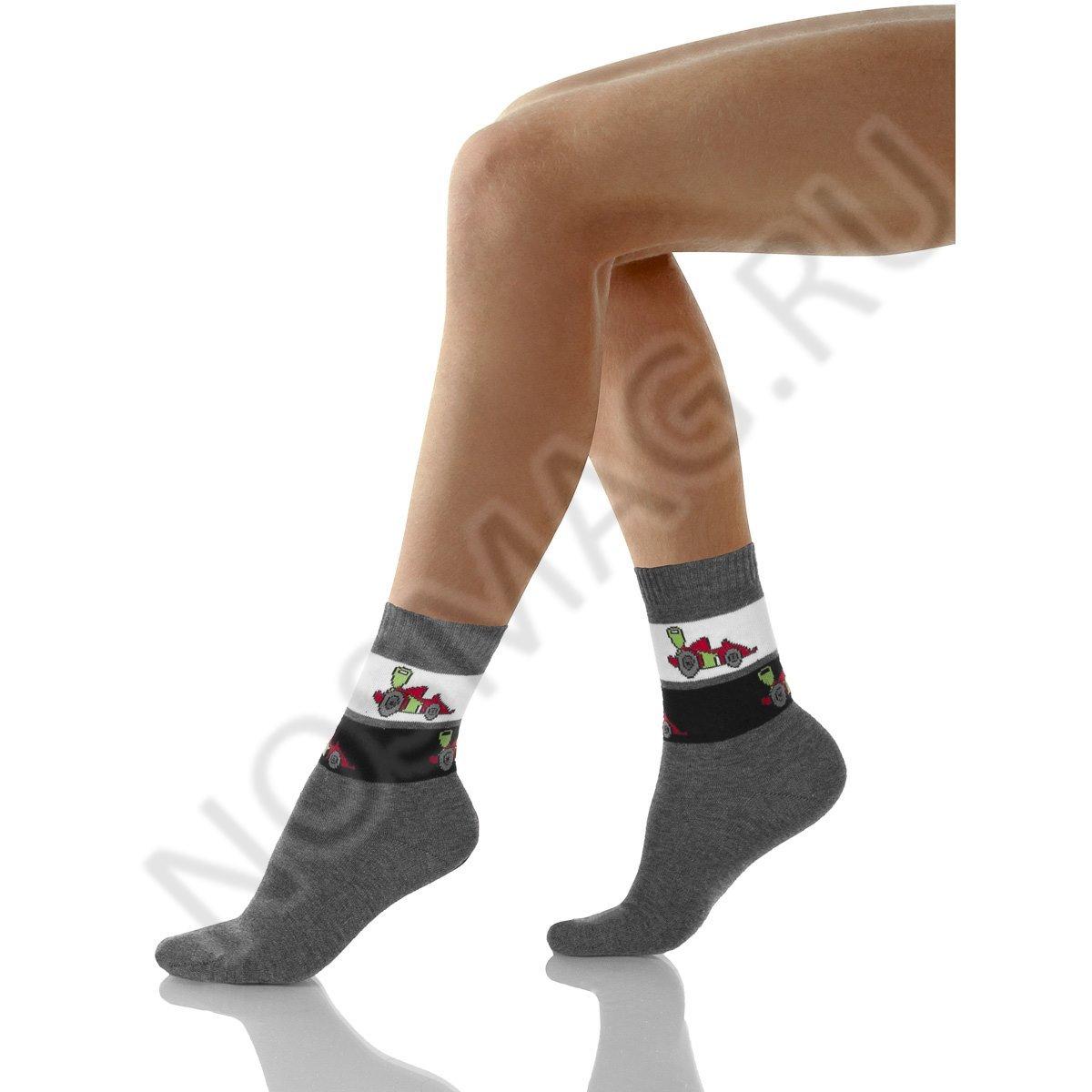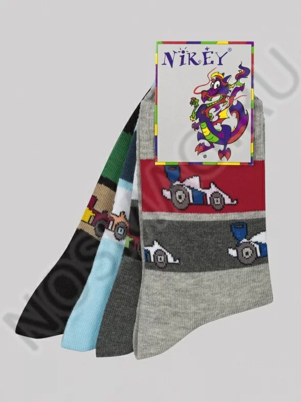 Трикотажные носки классической длины для мальчиков. Они декорированы контрастными полосками с принтом в виде гоночных машин.