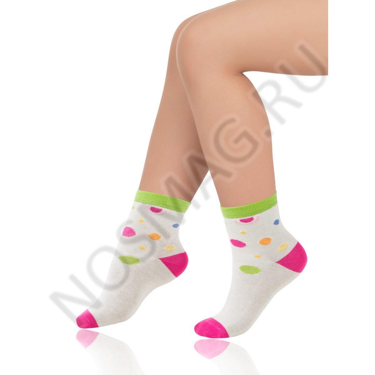 Очень яркие носочки для девочек. Они украшены узором с разноцветными кругами на светлом фоне, а яркие пятка, носок и резинка дополняют узор.
