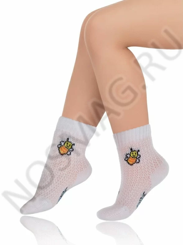 Удобные трикотажные носки для девочек. Они украшены ярким принтом с весёлыми пчёлками. Носок и пятка сделаны из уплотнённого трикотажа.