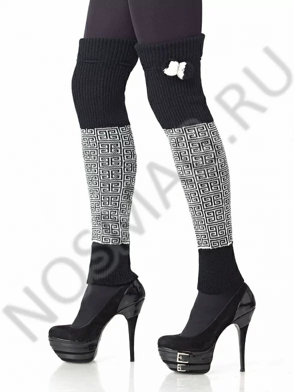 Стильные гетры с оригинальным контрастным геометрическим узором, напоминающим QR-код. Очень стильная модель, способная подчеркнуть любой образ. Гетры украшены помпонами.
