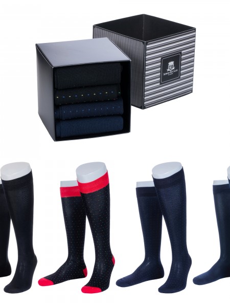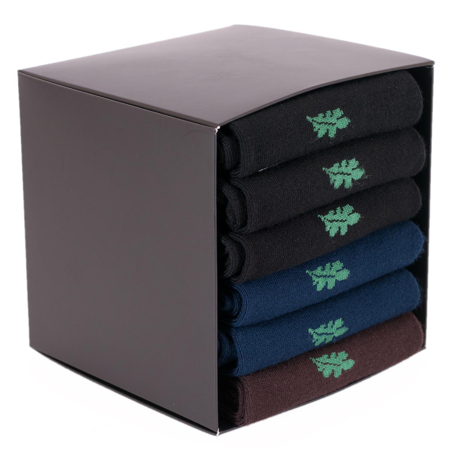 Набор состоит из 3 пар черных, 2 пар темно-синих и 1 пары коричневых носков артикула 15D11, сложенных с индивидуальными фабричными этикетками в фирменную коробку-кубик, которая дополнительно упакована в плотный транспортный картон для сохранности при доставке.