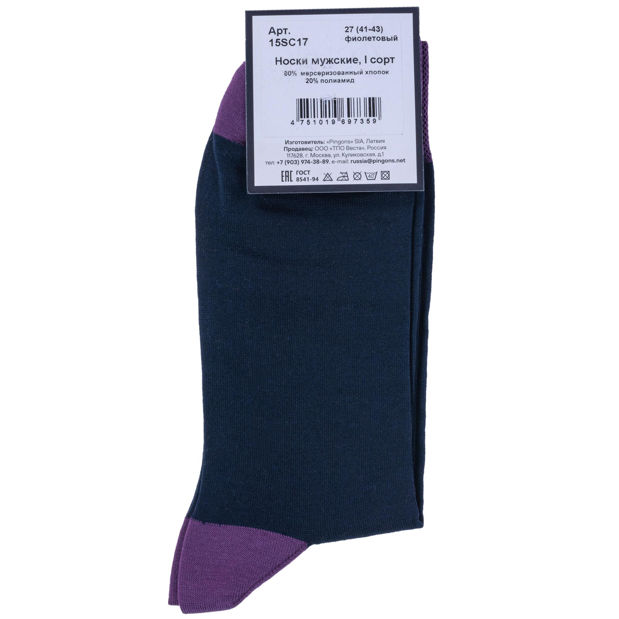 Пара сине-фиолетовых носков артикула 15SC17 с фабричной этикеткой поставляется в прозрачном пакете с дополнительной транспортной упаковкой.