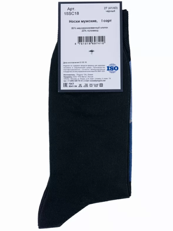 Пара черных носков артикула 15SC17 с фабричной этикеткой поставляется в прозрачном пакете с дополнительной транспортной упаковкой.