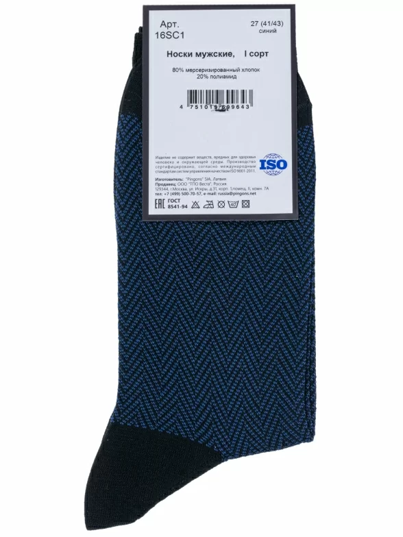 Пара синих носков артикула 16SC1 с фабричной этикеткой поставляется в прозрачном пакете с дополнительной транспортной упаковкой.