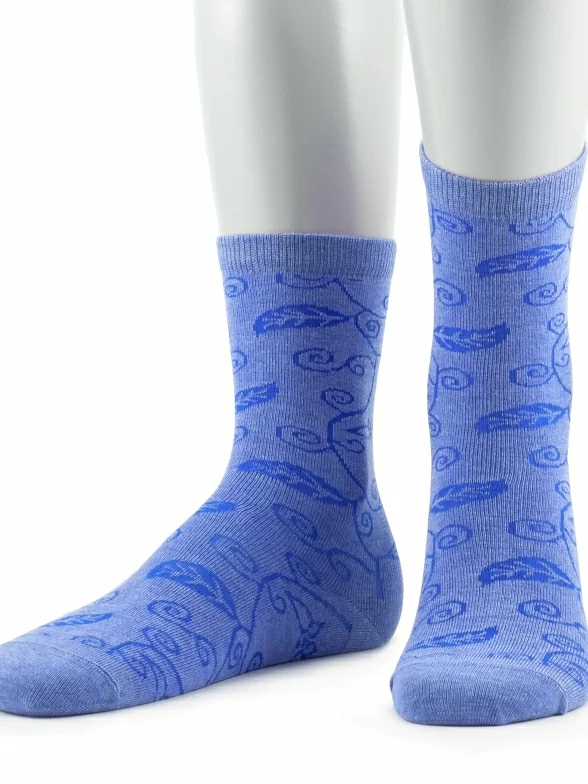 Ажурные женские носочки из хлопка с добавлением микромодала. Они декорированы растительным орнаментом и отличаются повышенной комфортностью. Все швы - плоские. Модель имеет двойной борт, а также усиленные мысок и пятку.