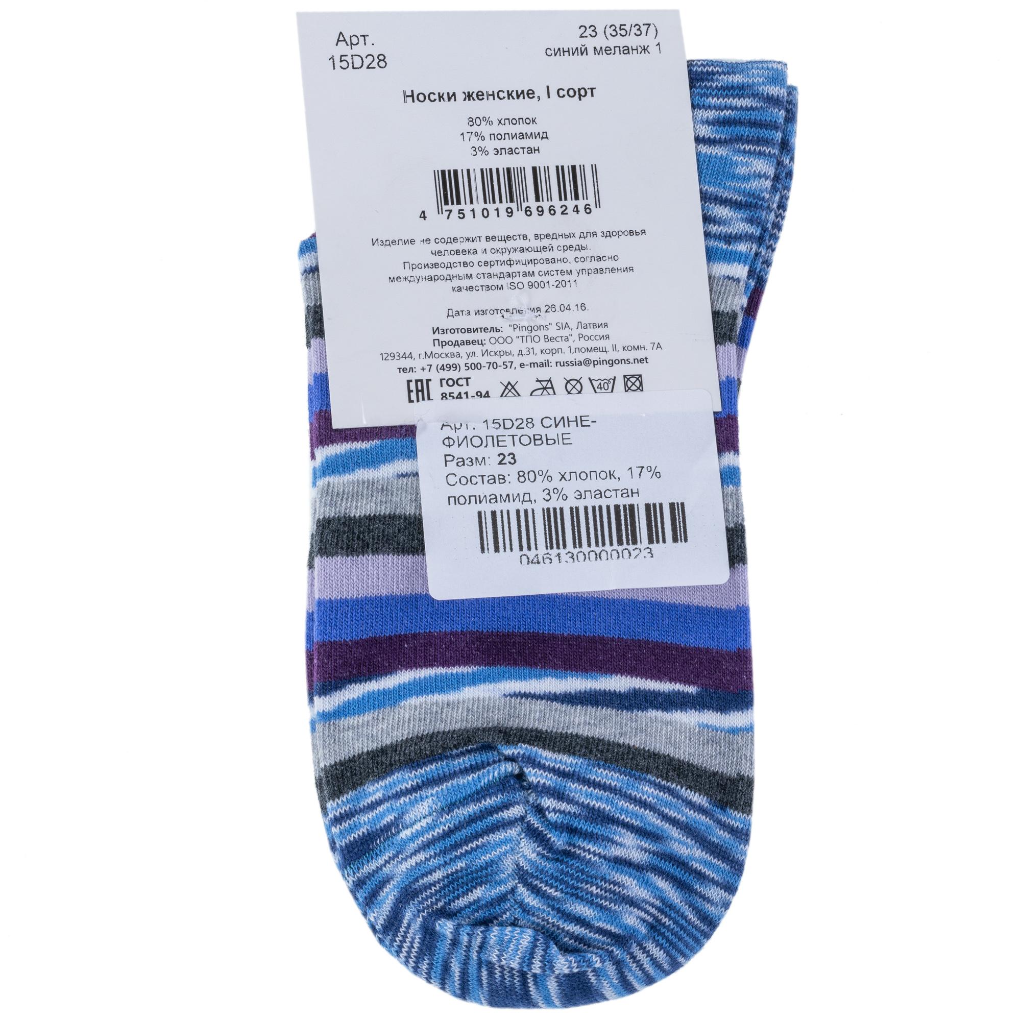 Пара сине-фиолетовых носков артикула 15D28 с фабричной этикеткой поставляется в прозрачном пакете с дополнительной транспортной упаковкой.