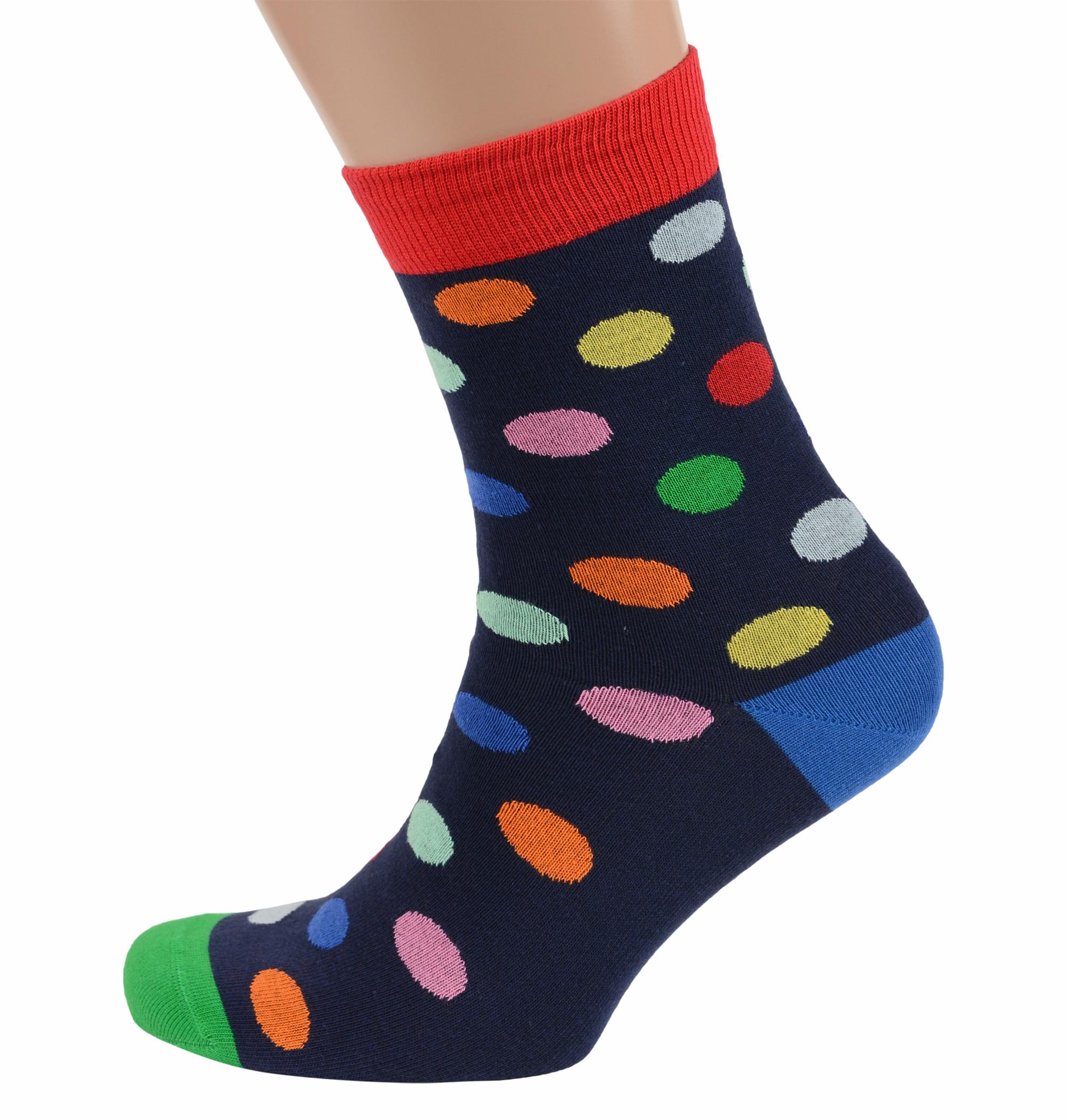 Яркий фантазийные мужские носки с принтом в разноцветный горох. Пятка, мысок и резинка – однотонные, выполненные в разных цветах под стать узору. Носки изготовлены из плотного качественного трикотажа и очень удобны. Модель также отличается высокой износостойкостью.
