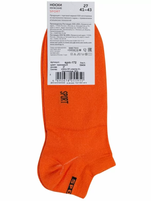 Мужские короткие спортивные носки ХОХ, SPM-172, ОРАНЖЕВЫЕ