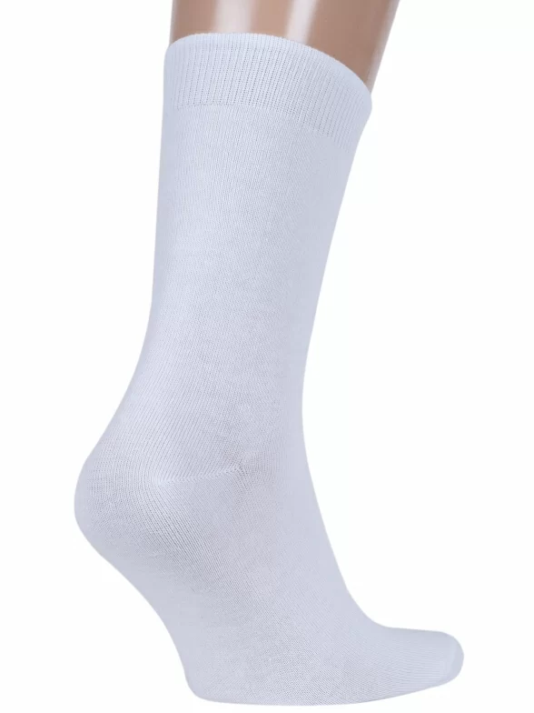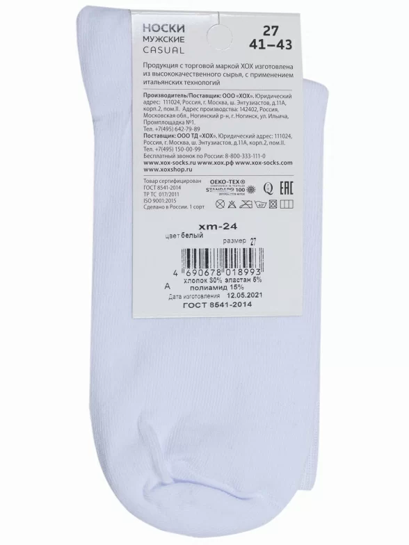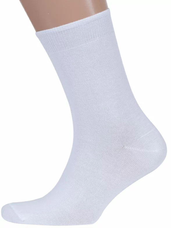 Круглогодичные средней длины мужские носки, цвет белый, классические, шов кеттельный (бесшовная технология), принт (рисунок): однотонный, без рисунков/узоров, состав: 80% хлопок, 15% полиамид, 5% эластан, арт. XM-24. Производитель «ХОХ» Россия под брендом «Хох».