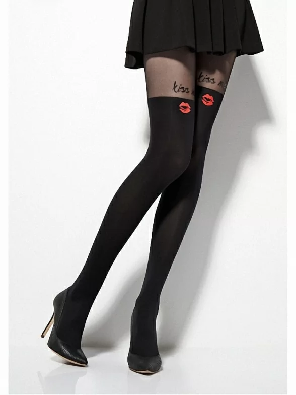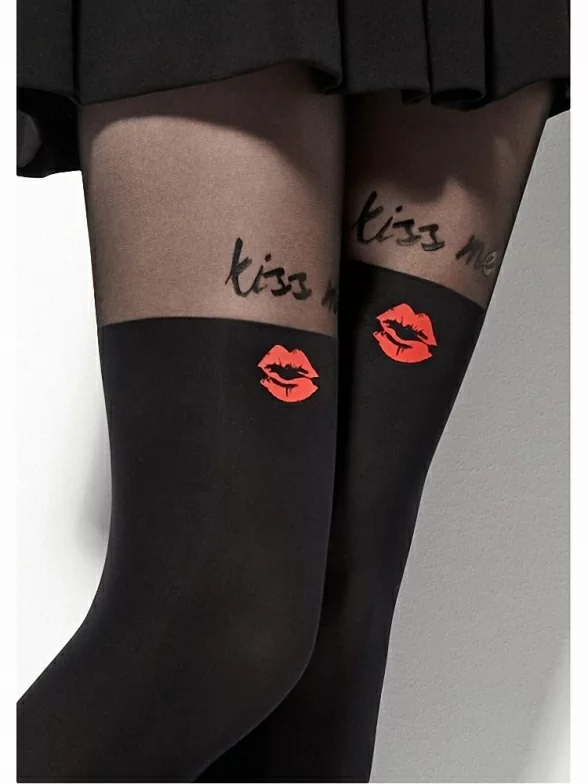 Очаровательные фантазийные колготки с имитацией чулок. Модель комбинированной плотности: верх 20 Den, низ – 60, за счет чего создается ощущение что на вас действительно надеты чулки. Милый узор в виде контрастного цветного отпечатка губ и с надписью “Kiss me” добавляет модели игривости. Колготки сделаны по бесшовной технологии, ластовица выполнена из хлопка.