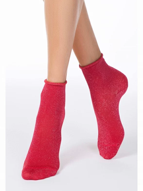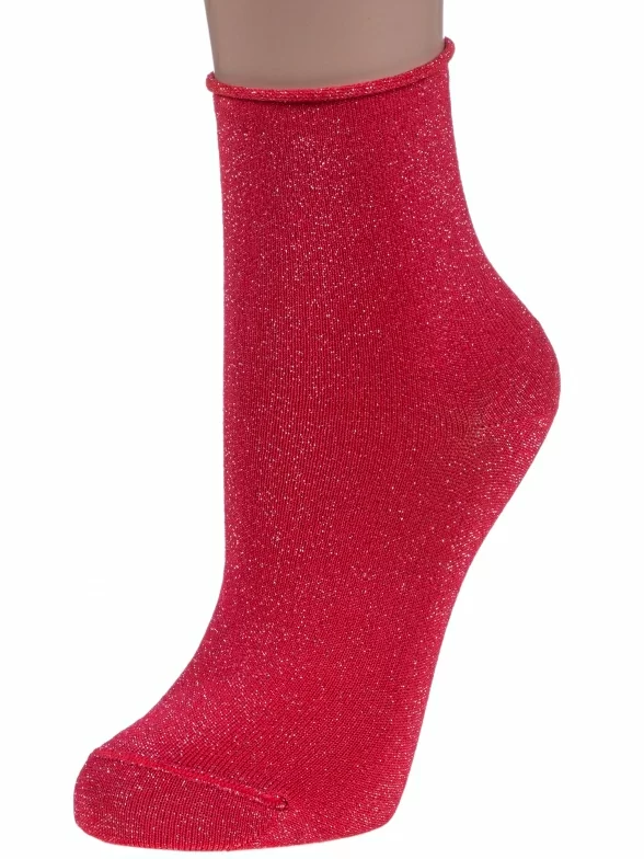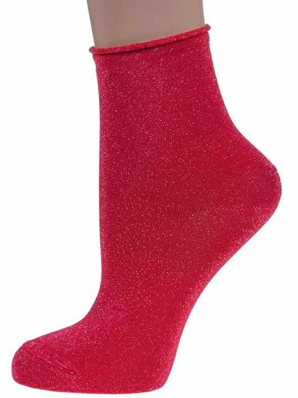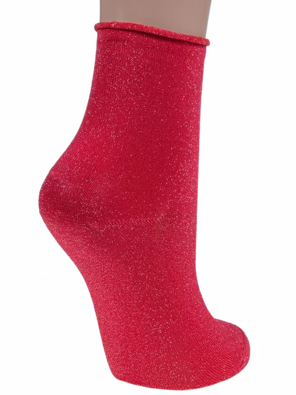Женские носки сделаны из вискозы с добавлением люрексовой нити. Однотонная модель связана без резинки.