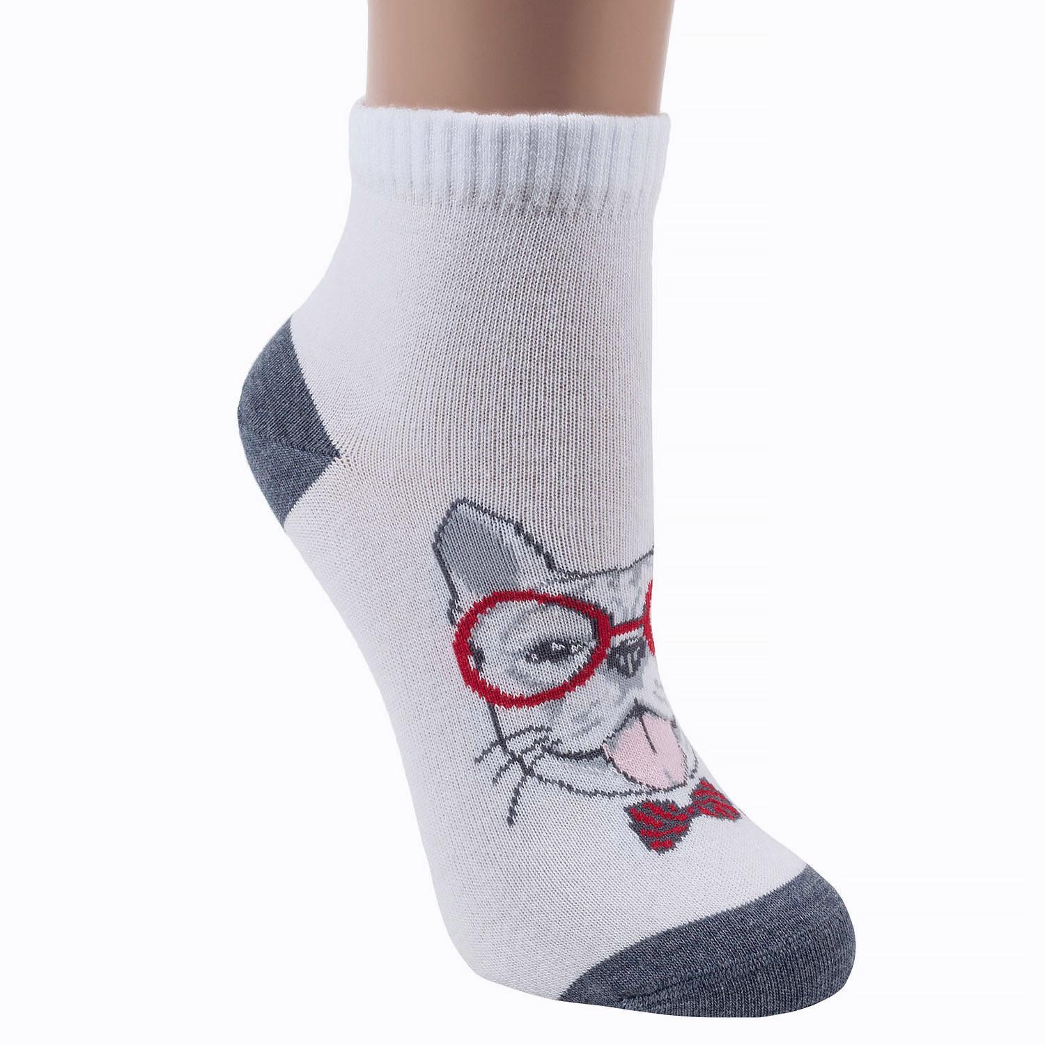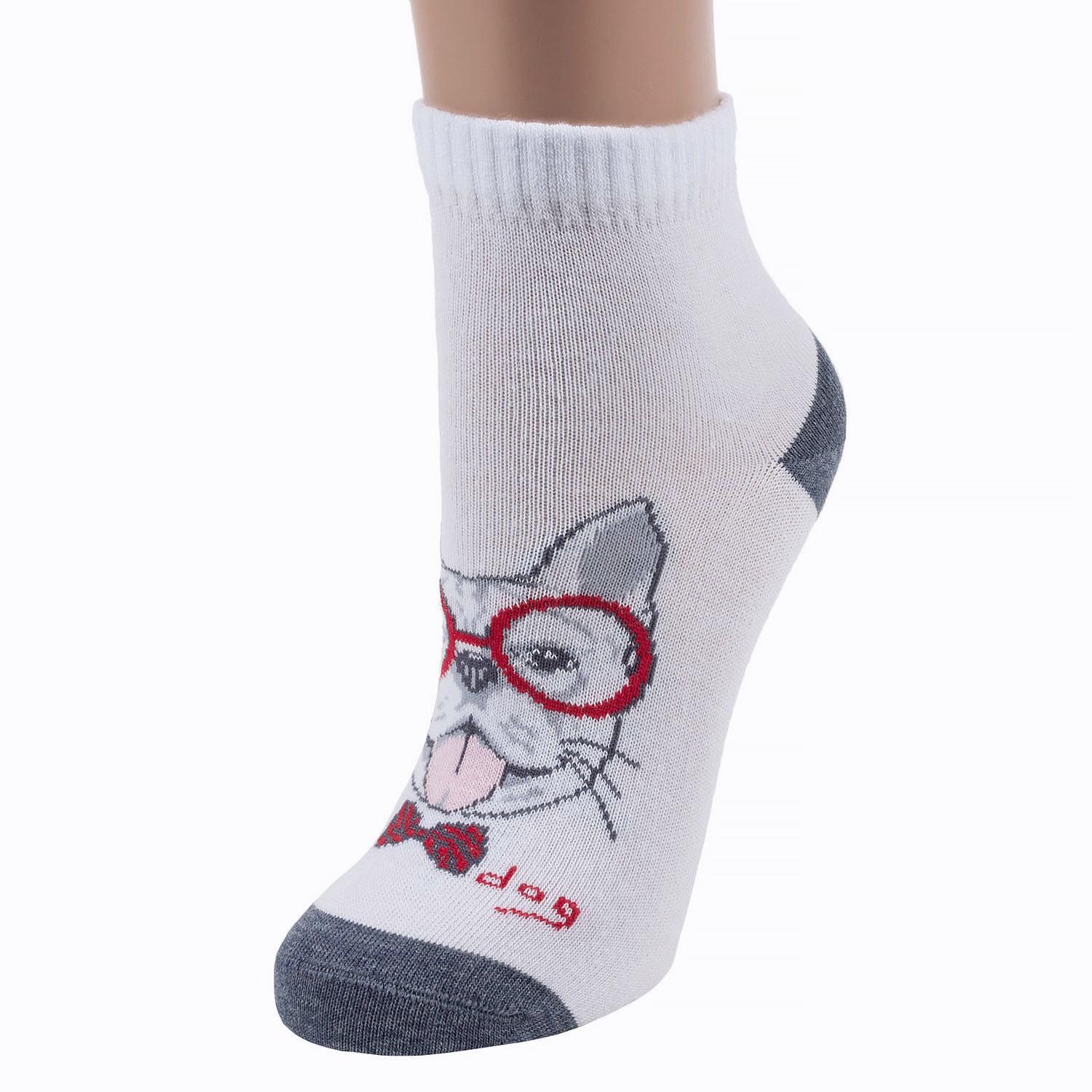Отличный выбор для любительниц собак! Очаровательные укорчоенные носки с принтом в виде забавного пёсика. Модель также оформлена контрастными элементами. Мягкая резинка модели не создает излишнего давления.